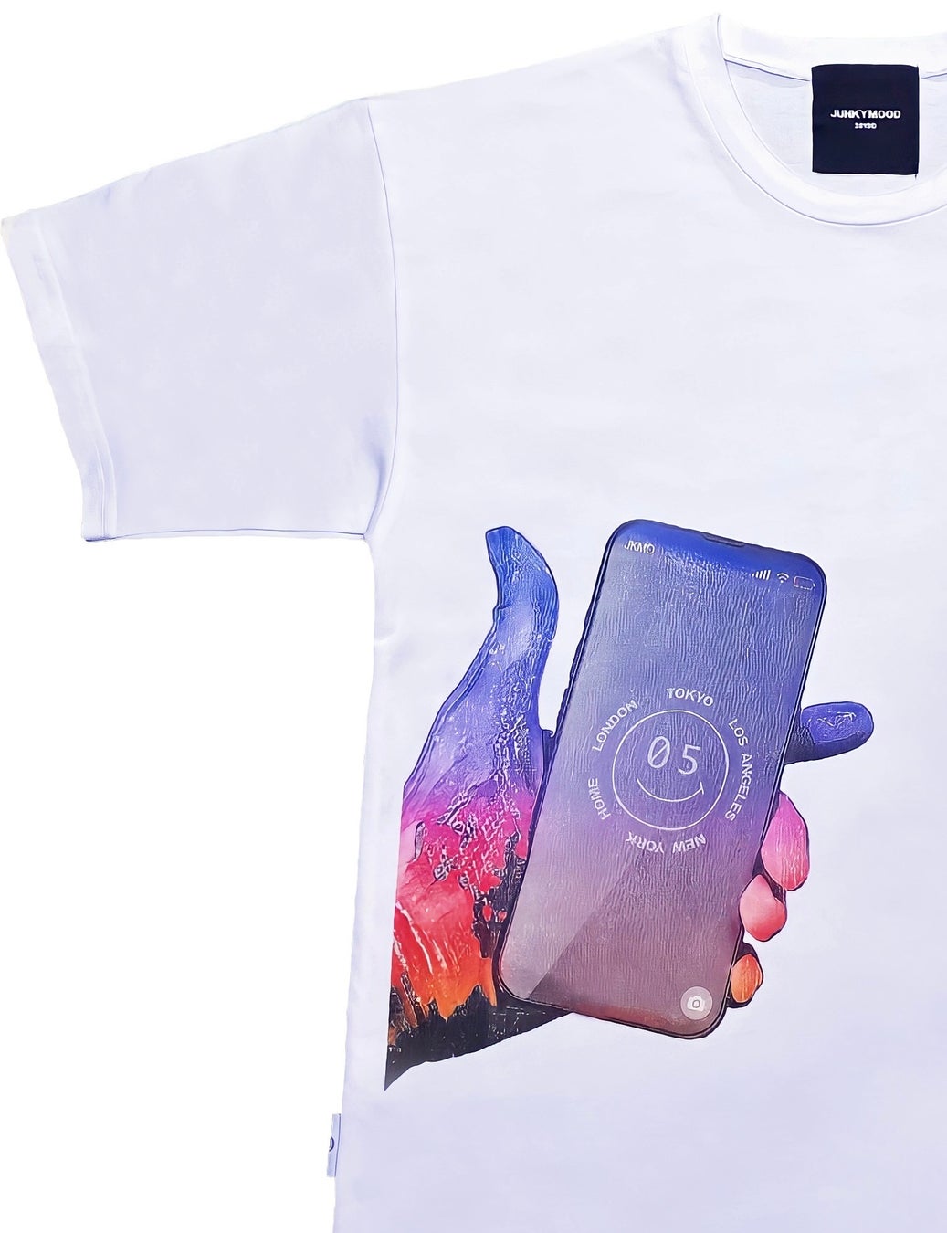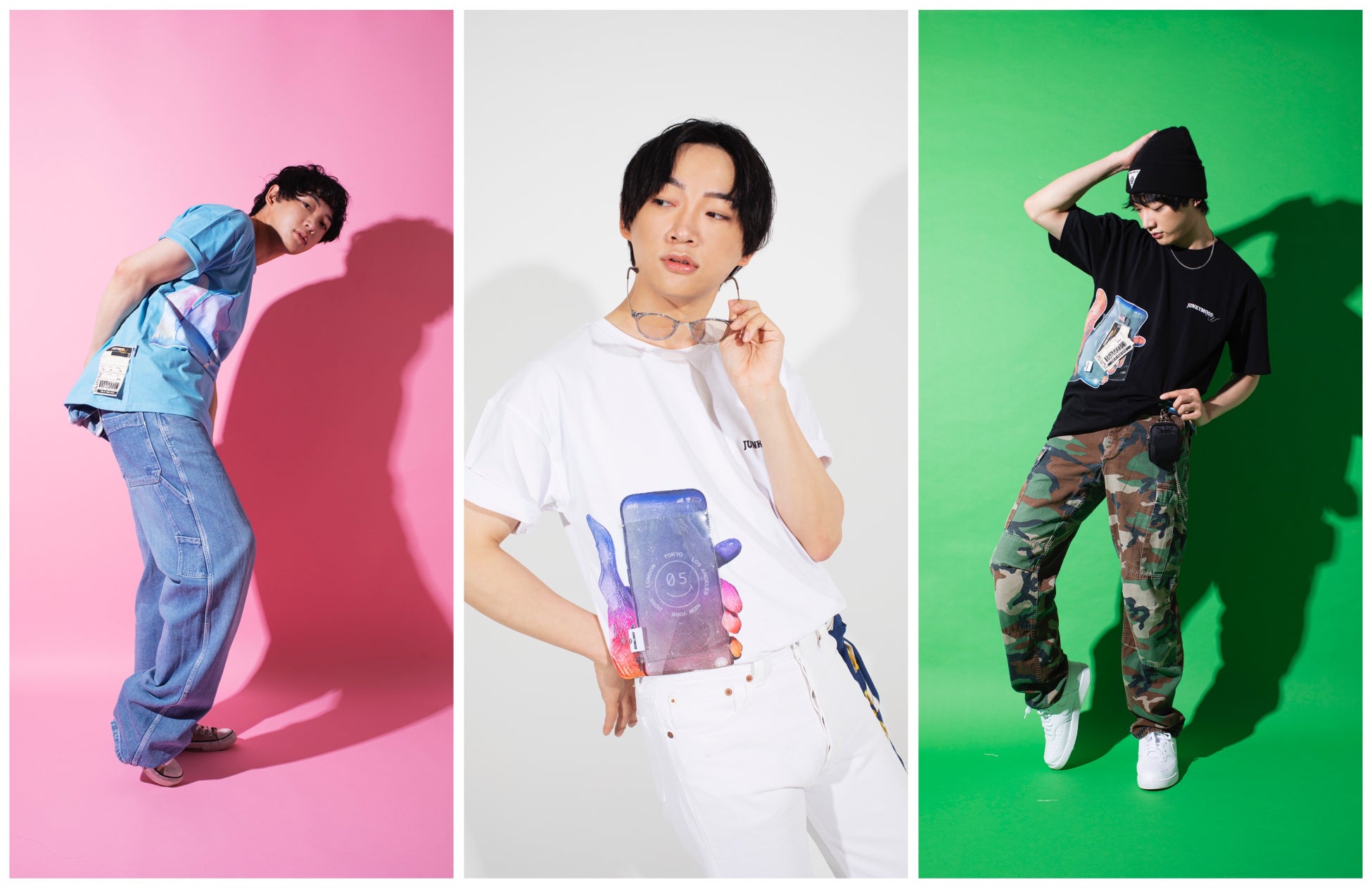 本コラボレーションアイテムは、「JUNKYMOOD」オリジナルのTシャツに和合氏の”自撮り“をモチーフとしたデザインを大胆にプリント。フロントには、グラフィックデザインやイラストレーションを得意とする和合氏が自ら描いたセルフィーポーズを、ヴィンテージ加工や様々な手法を用いり、バックにはコラボレーションならではの装飾タグを施しました。装飾タグには、和合氏を連想させるロゴやメッセージなど遊び心満載のこだわりが詰まったオリジナルデザイン。