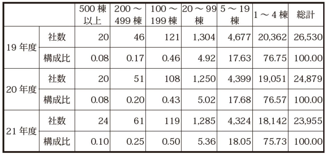 年間20棟以上を供給する企業の社数はいずれも増加した一方で、20棟未満では減少しており、零細企業の淘汰が進んでいると見られる。
