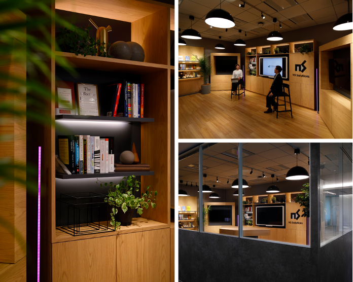 TRENCHは日米特許技術である「CI技術」を搭載したオフィステック®︎を用い、社員の皆さまから創出された多様なアイデア、願望を基に、NSSOLのミッションに基づいた空間設計・デザインを行いました。お客様の0→1 を実現する過程での様々な利用シーンに応じ、フレキシブルにレイアウト変更可能な造作家具で空間を構成しています。また創造性や思考が豊かになるよう、バイオフィリックの観点から自然を取り入れ、照明を活用して空間を演出できるインテリアデザインとしています。