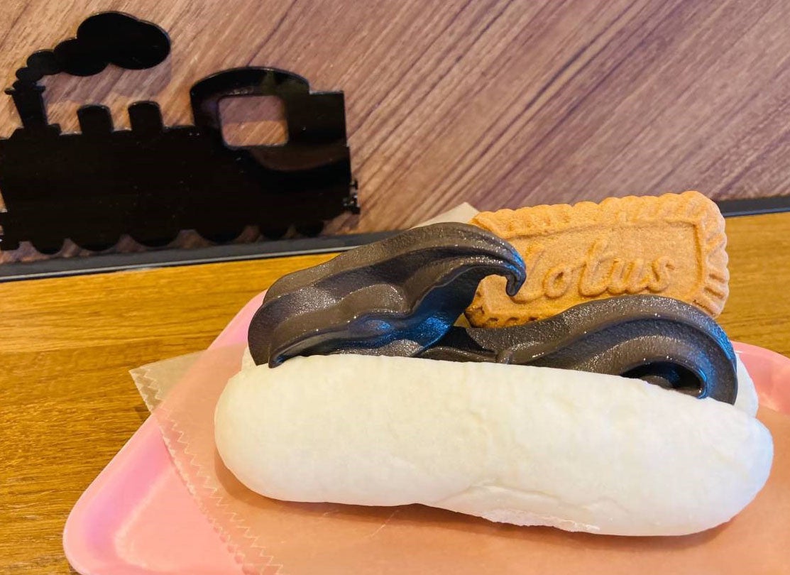【特徴】SLをイメージした黒いソフトクリームを挟んだコッペパンです