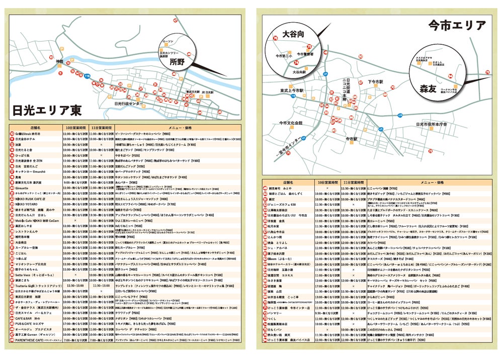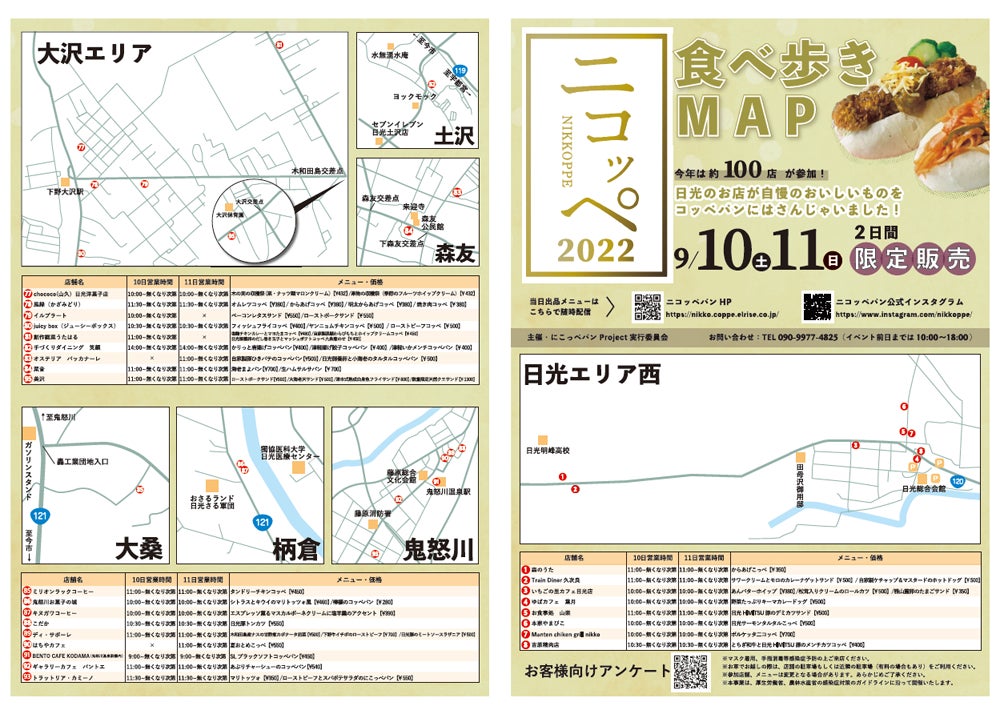 日光の“食“を彩る多数の名店が、人気メニューや地元の素材を活かしながら楽しくて美味しいオリジナルのコッペパンを考案し販売します。秋の気配漂う日光の散策とともに、気軽なグルメを満喫していただけるイベントです。