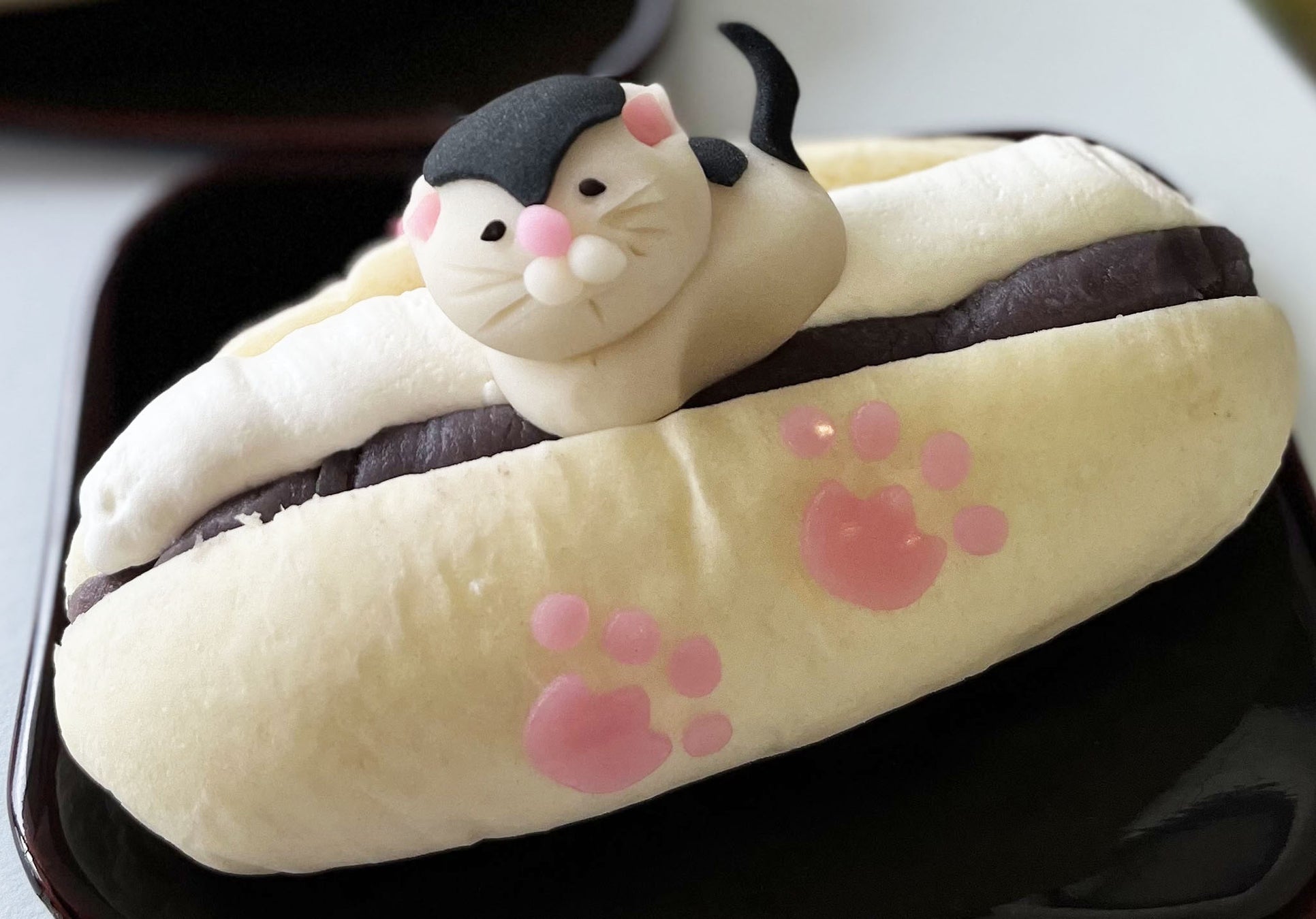 【特徴】老舗和菓子屋さんが創る「眠り猫」をモチーフにしたかわいらしいコッペパンです