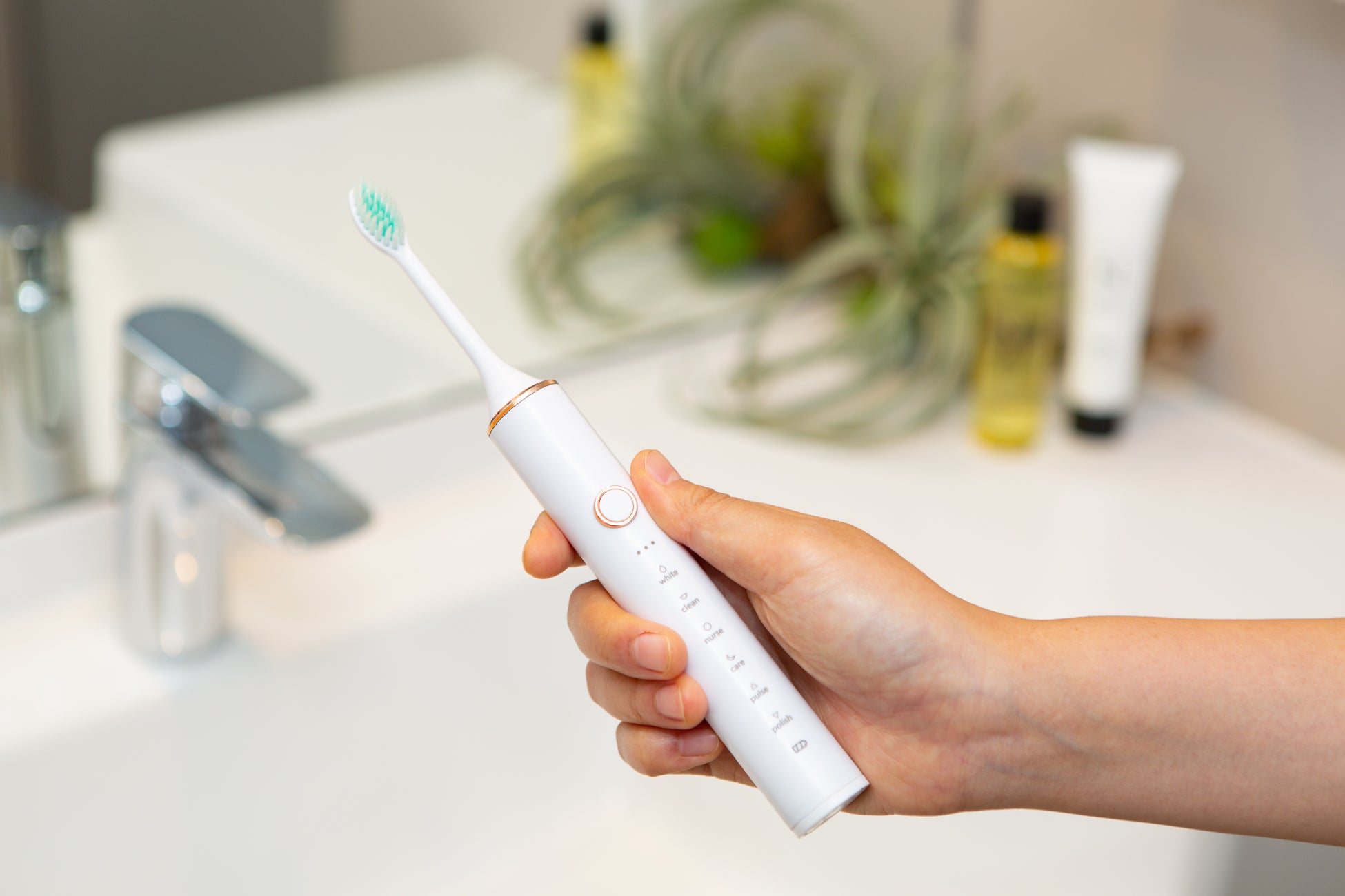35,000回/分の音波振動で、手磨きでは実感できないツルツル仕上げに。5つの振動モードを搭載し、歯と歯ぐきの健康と美容をサポートします。