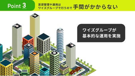 賃貸管理や運用に関しては、ホテル・商業施設等を中心に不動産開発業務を手がけてきたワイズグループで行うため、投資家の皆様の手間を最大限抑えることができます。