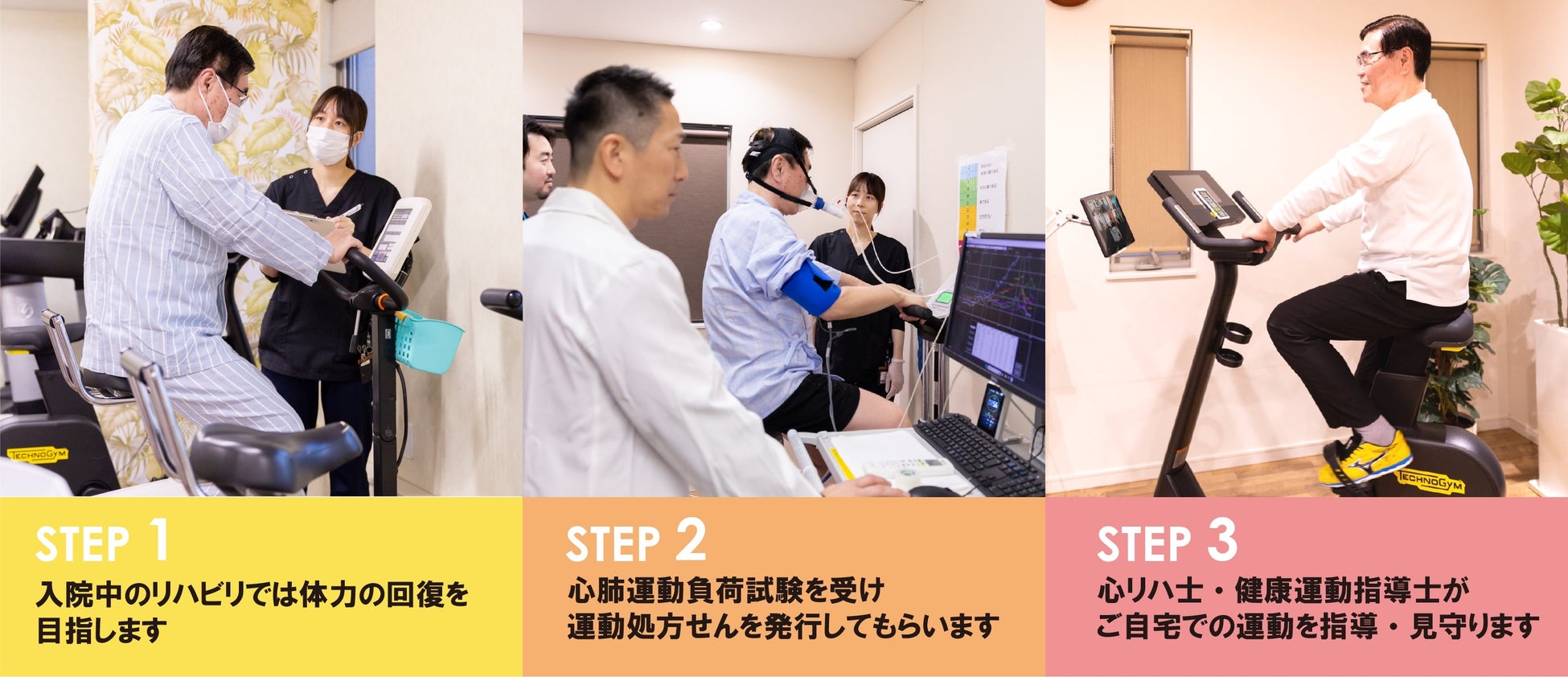 ③日本心臓リハビリテーション学会認定の心臓リハビリテーション指導士(心リハ指導士)が参加者の体調、運動中の様子をうかがいながら、運動処方に従って安全に配慮した運動を指導します。(代表的な運動:エルゴメータ、体操、ヨガ)