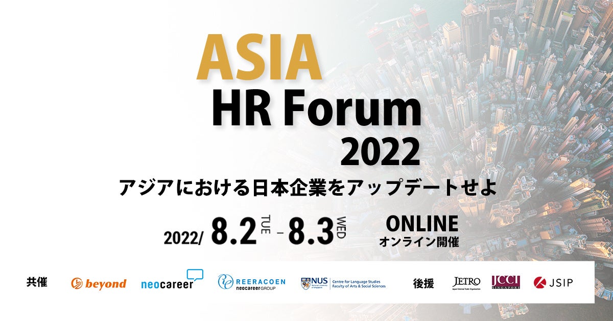 シンガポール、日本、タイの3カ国で人事・組織コンサルティングを提供するbeyond global group は、株式会社ネオキャリア および、REERACOEN Singapore、100カ国以上の学生が集うアジアでもトップクラス大学のシンガポール国立大学 言語研究センターと共に、オンラインイベント「ASIA HR Forum 2022」を、2022年8月2日(火)・8月3日(水)の期間に開催します。