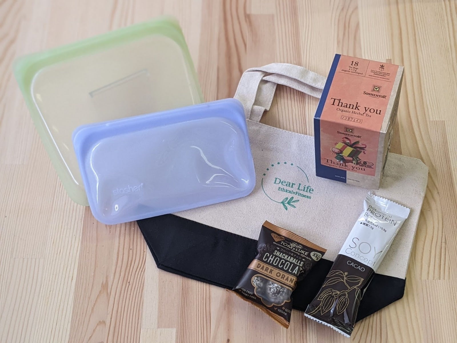 オープン1周年記念として、健康・美容・トレーニング、そしてエシカルをテーマとした限定セットを数量限定で販売いたします。プレゼントにもぴったりなアイテムが「Dear Lifeオリジナルエコバック」に入った豪華6点セットです。(¥ 5,521(税込)相当)