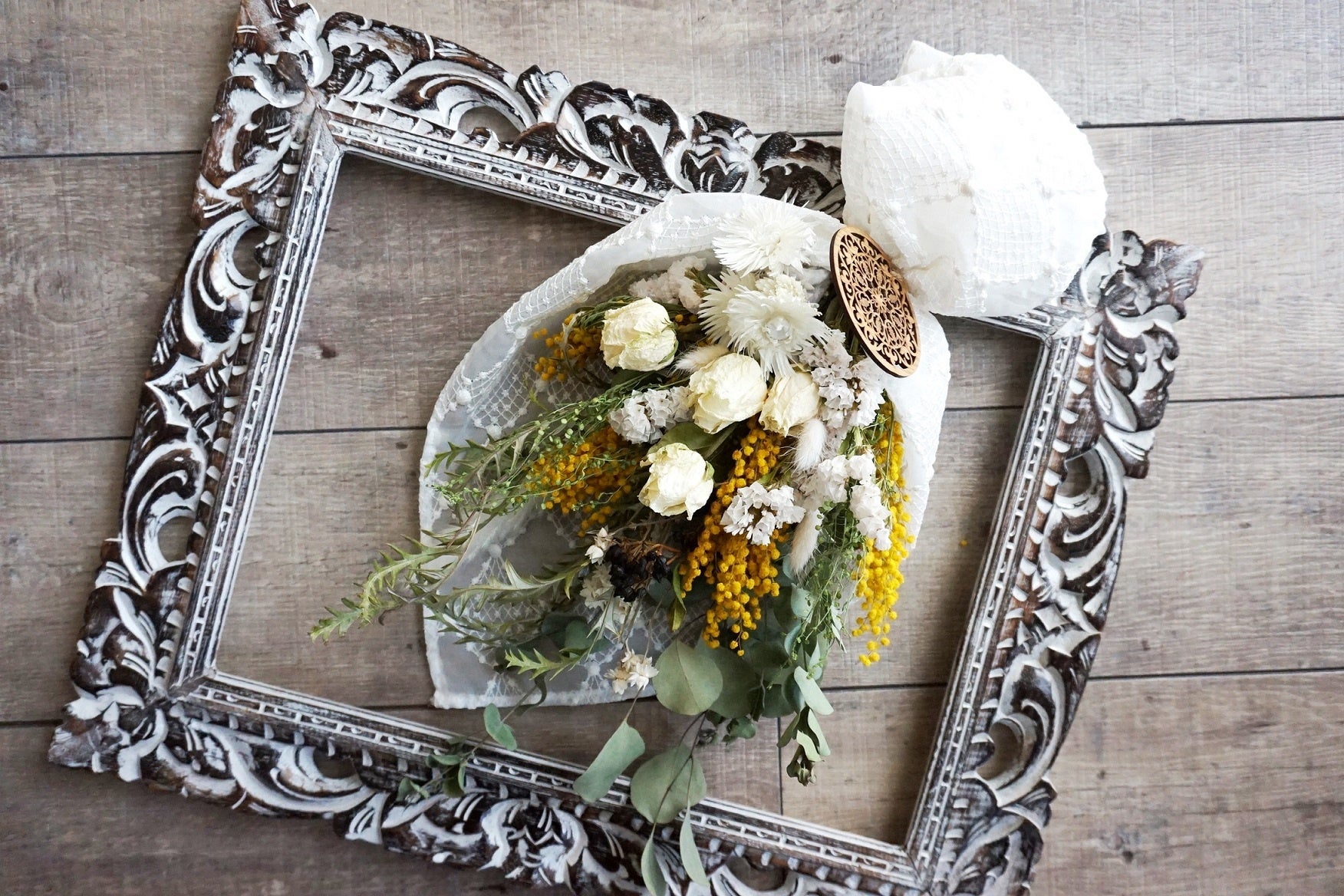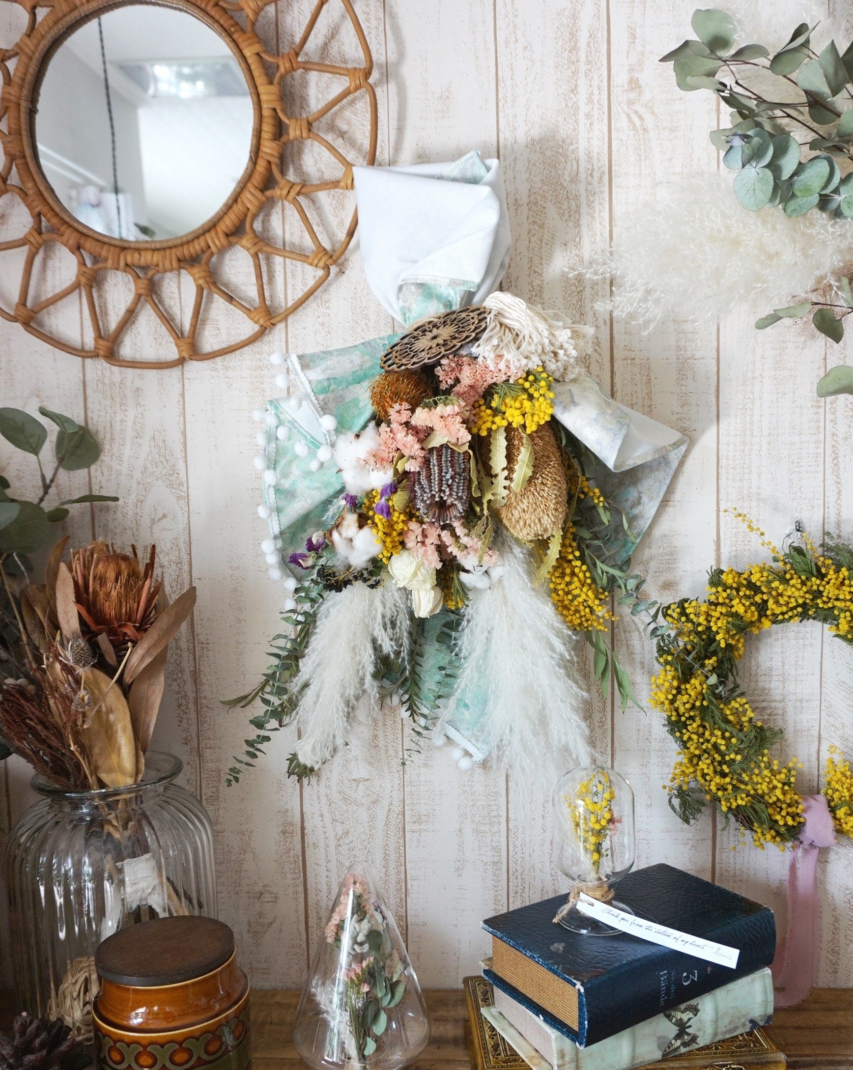[生地をあしらったドライフラワーの花束をオーダーメイド]
