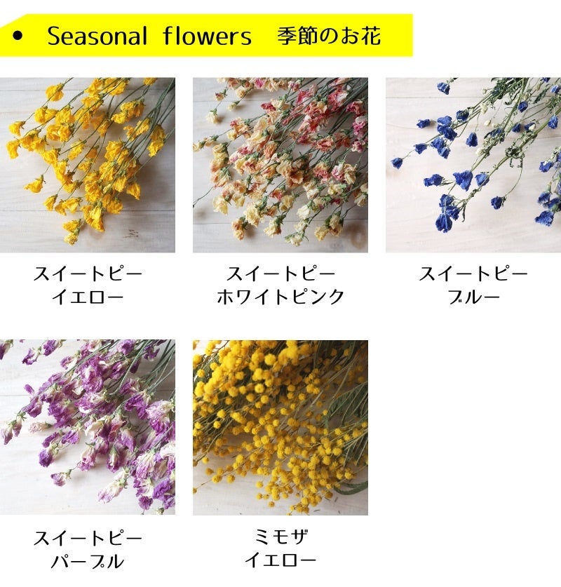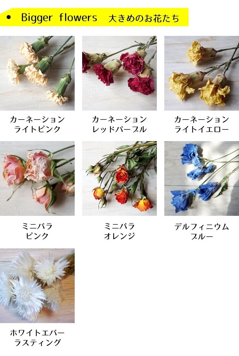 中に入れるお花はメインのお花とアクセントとなるお花を合わせるとMサイズは26種類、Lサイズは33種類の中から好きなお花をお選びいただくことができます。