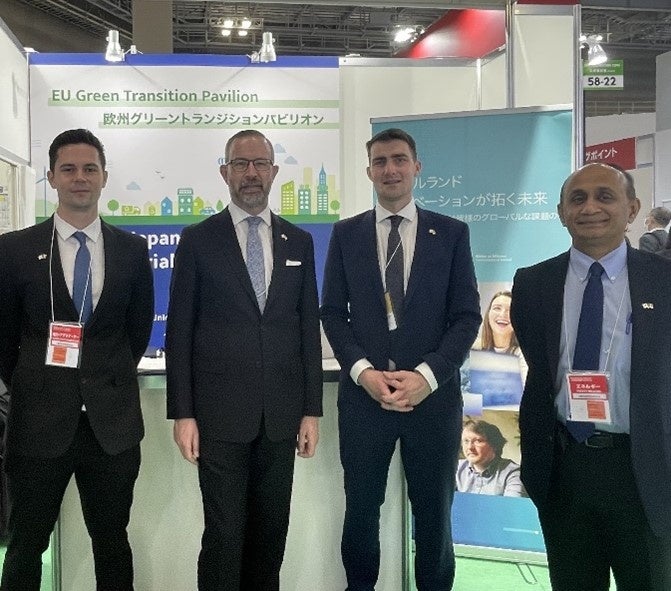 アイルランド交通省の国務大臣(国際・道路交通・物流担当)、環境・気候・通信省・郵政政策担当大臣であるJack Chambersが2023年3月15日(水)~17日(金)に東京ビッグサイトで開催中のスマートエネルギーWeekを視察、アイルランドのスタートアップ企業GridBeyond社(本社:アイルランド国ダブリン市、CEO:Michael Phelan)の展示ブースを訪問しました。また、Amarenco社(本社:アイルランド国コーク市、CEO:Alain Desvigne)の担当者とも会談の時間を持ちましました。