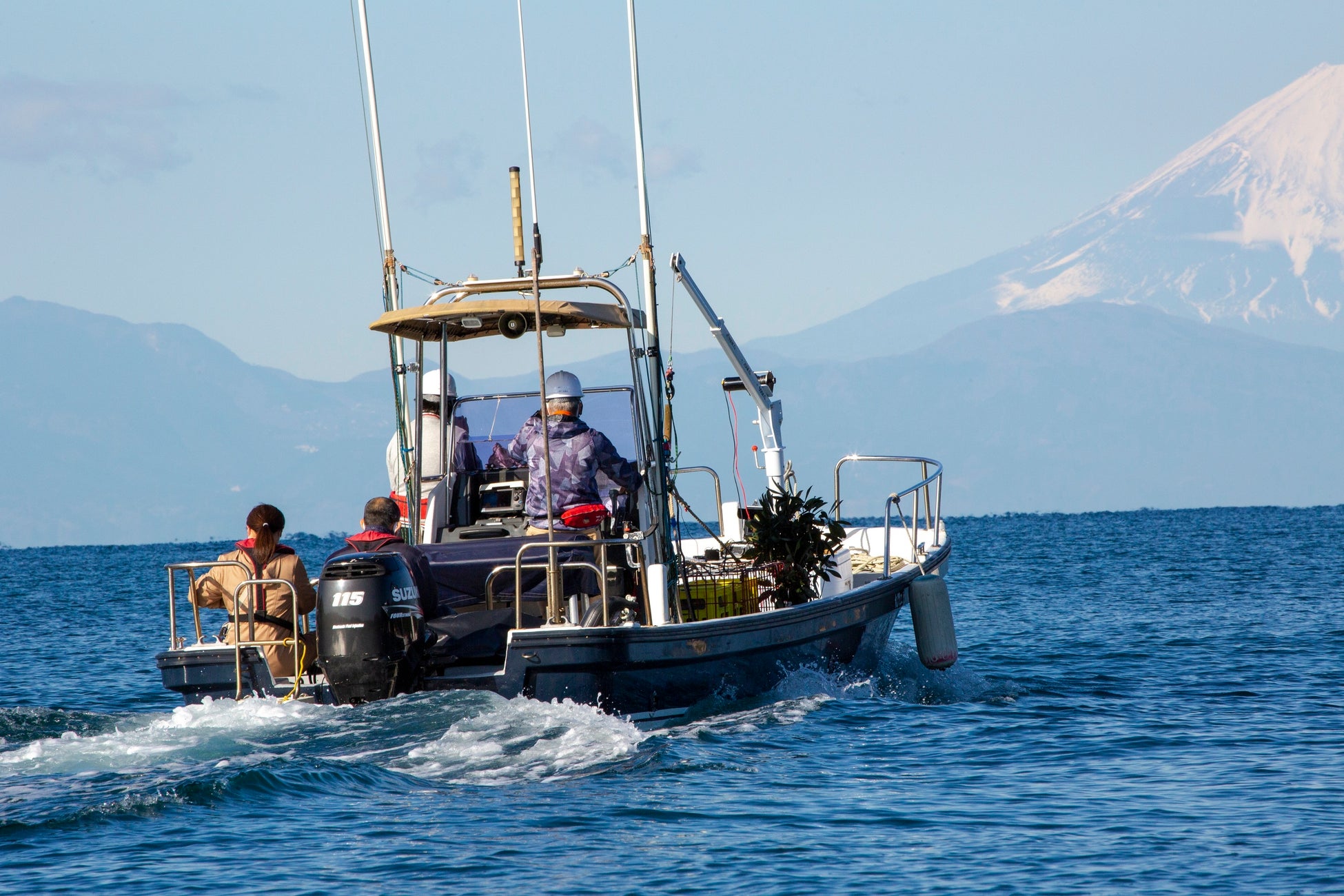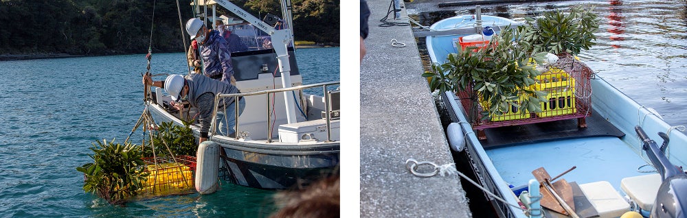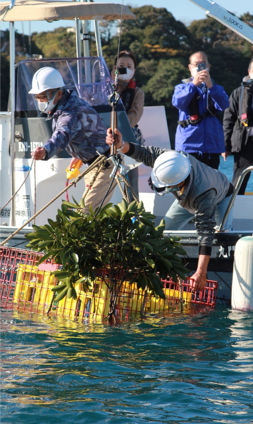 2021年12月13日(月)には,青空のもとで,みうら漁協の漁師の方々が,穏やかな小網代湾の海底に,お客さまの想いが詰まったワインボトルを丁寧に沈める作業を実施しました。一般募集により集まったワインボトルの総数は,過去最多の約1,700本。年内を目途にすべてのボトルを沈下する予定です。