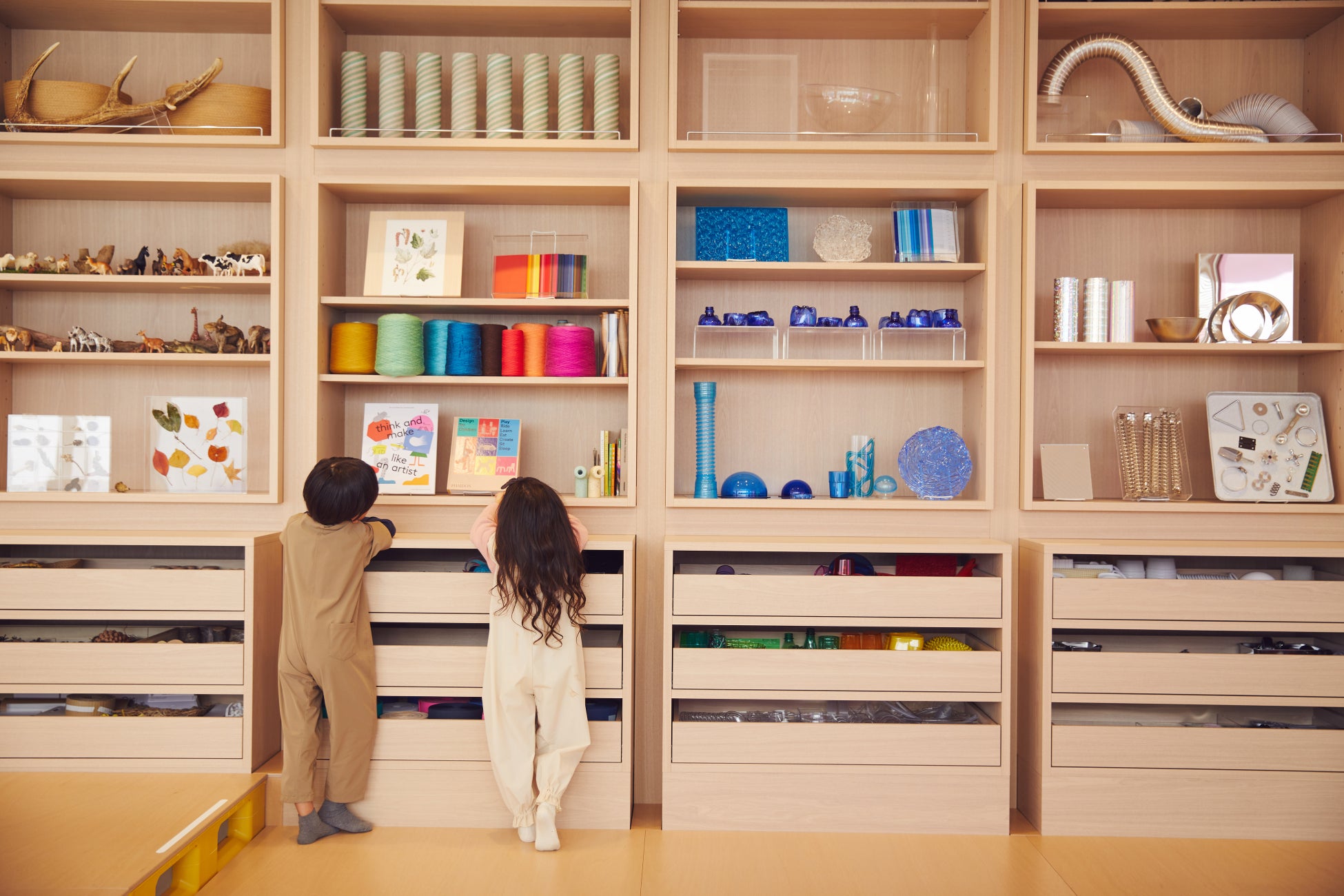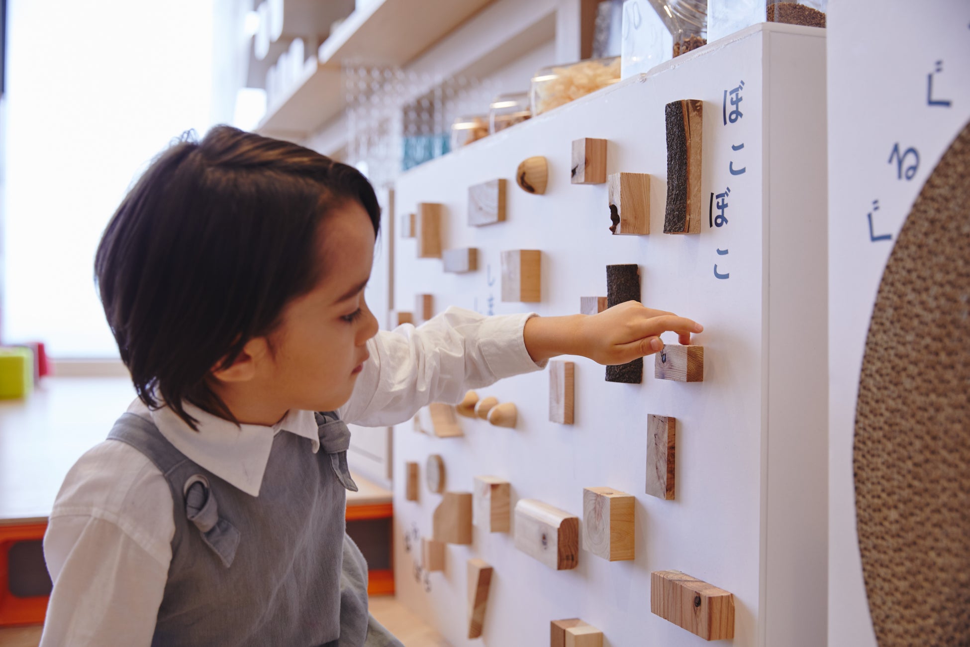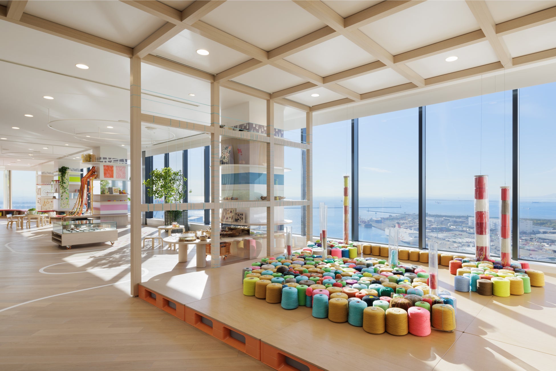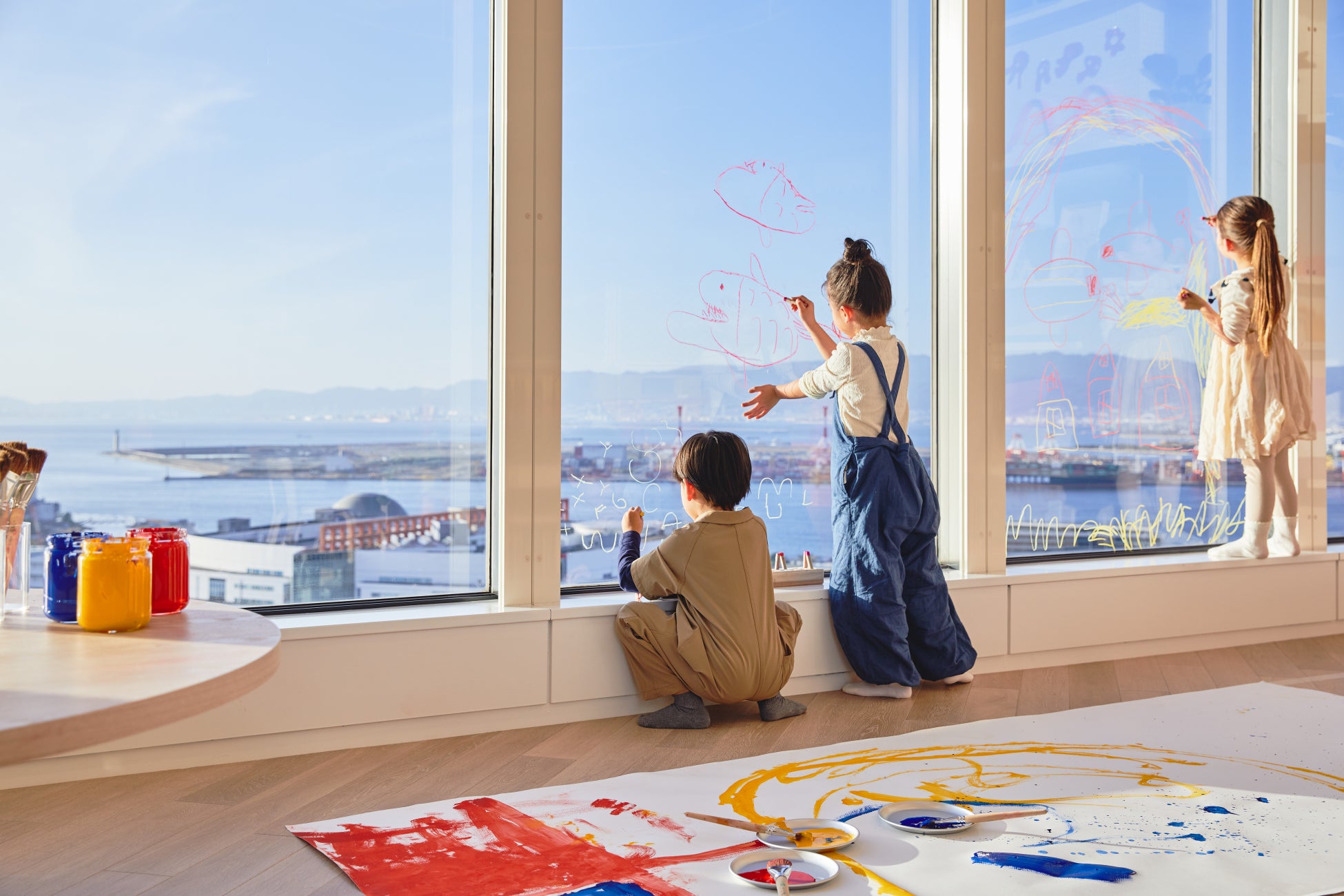 大阪湾を一望できるホテルの最上階28階に、日本最大級(約470平米)のアトリエがあります。物流拠点である大阪南港をテーマにカラフルなパレットを積み重ねたリズムのある楽しく洗練された空間が特徴です。ここでは、用意された沢山の素材(マテリアル)を見つめたり、丁寧に関わったりしながら、そのモノが持つアイデンティティを知る時間を過ごせます。この時間を通して、自分の気になるものを選択し、工夫して考える、モノとモノの関係性から新しい遊びを発見していきます。このような主体的な行為が未来の可能性を生み出す「学び」の始まりだと、考えています。なお、アトリエ内は「興味」「探索」「表現」の3つのエリアがあり、それぞれで選択や探究をしていける造りになっています。