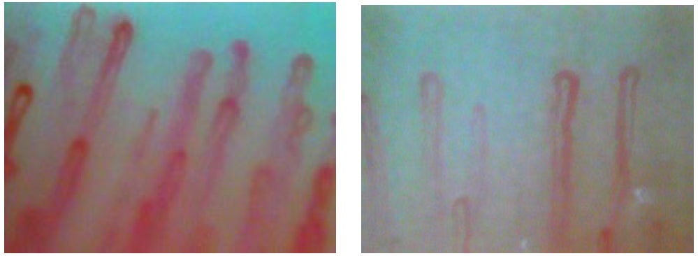 非糖尿病患者(左図)と糖尿病患者(右図)の爪床毛細血管スコープ写真を解析すると、糖尿病患者は非糖尿病患者に比べ、爪床毛細血管の本数減少、短縮化、狭小化、混濁化を認めた。