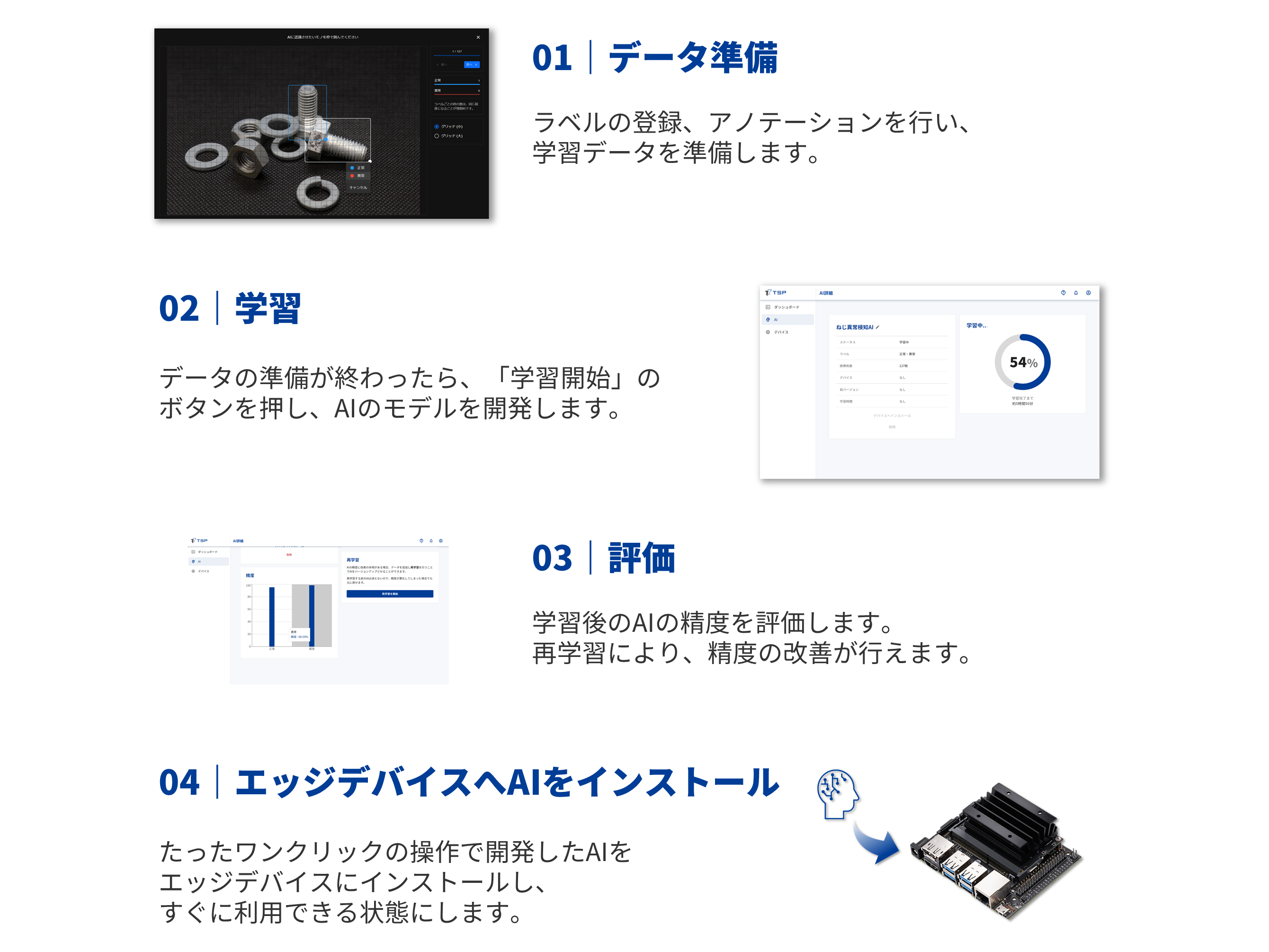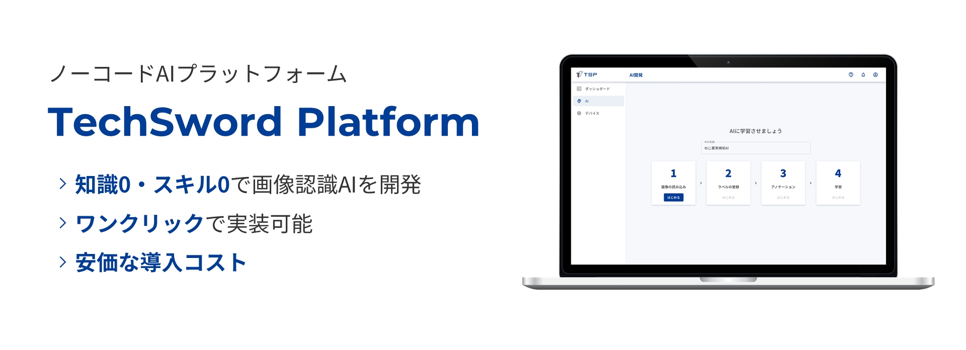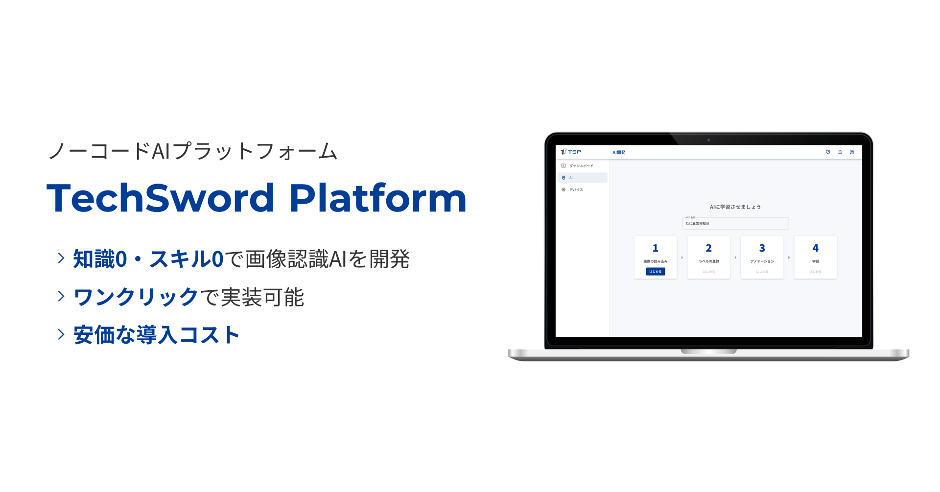 「TechSword Platform」(通称TSP)は直感的な操作のみで独自の画像認識AIを最短わずか1日で開発し、その後の実装もエッジデバイスへのワンクリックのインストールで実現することができます。当プラットフォームの活用により、従来の課題であった「AI人材の不足」と「外注コストの高さ」を解決し、簡単かつ低コストでAIをビジネスに導入することが可能となります。