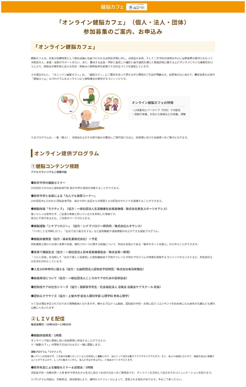 「オンライン健脳カフェ」は、これまで『「健脳カフェ」に行きたいけれど、遠方に住んでいるので行けない』『地方の施設ですが、「健脳カフェ」で展開しているプログラムや未病・予防対策の導入が出来ないか』などのご相談を多くいただいております中で、「健脳カフェ」のプログラムや役立つ情報がいつでも自由に動画視聴できる、また「健脳カフェ」のプログラムにオンラインで参加ができる配信プラットフォームです。