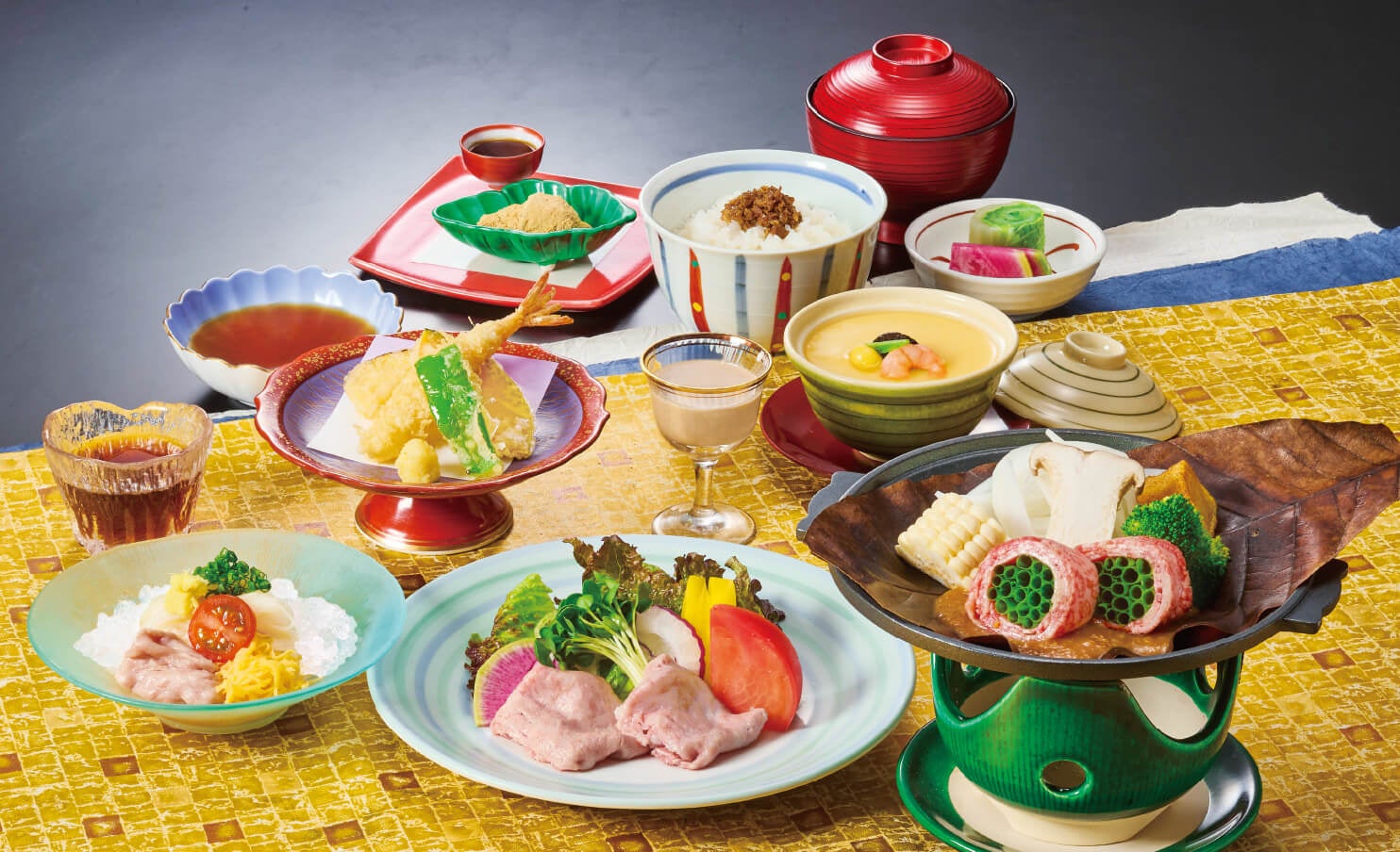 和牛冷しゃぶサラダ、三輪山本 手延べそうめん、和牛と季節野菜の朴葉焼き、茶碗蒸し、揚物、御飯、汁物、香の物、デザート