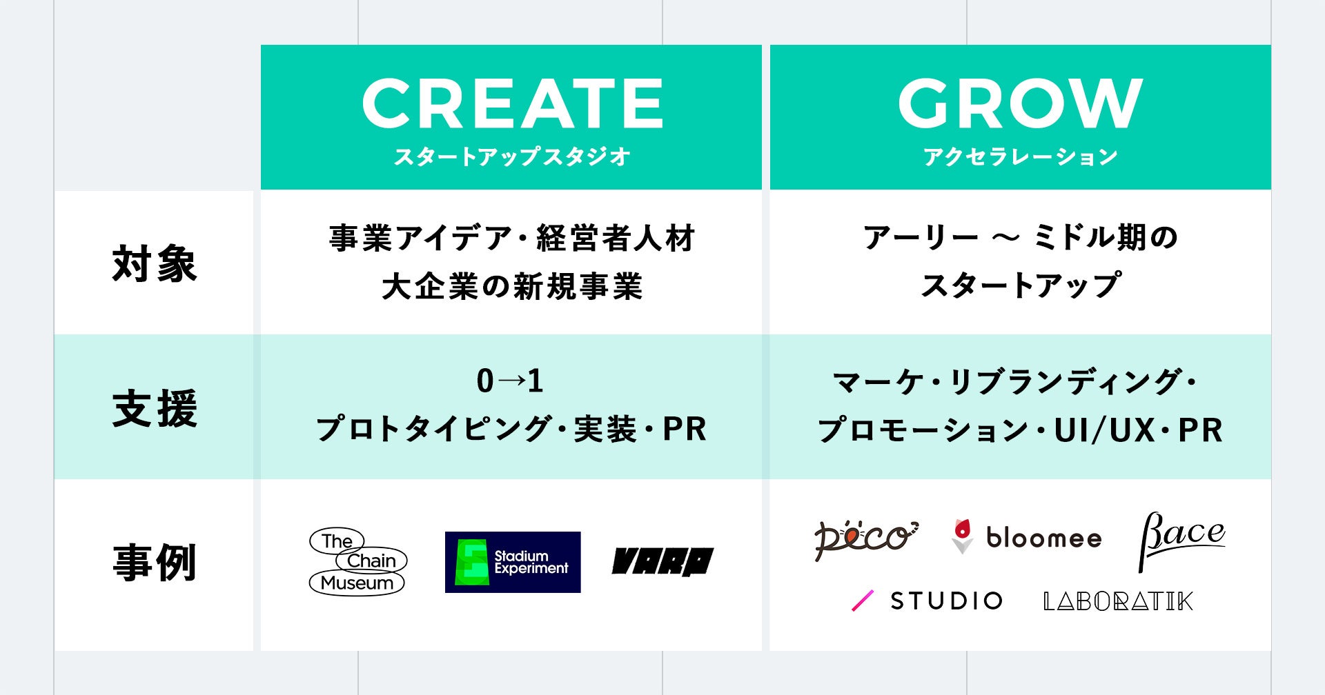 スタートアップに不足しがちな「マーケティング」「UI/UX」「PR」「ブランディング」を強化し、出資・ハンズオン支援を行います。また、パートナー企業スペシャリストの派遣や、大企業との連携交渉支援など、ご活用いただけます。