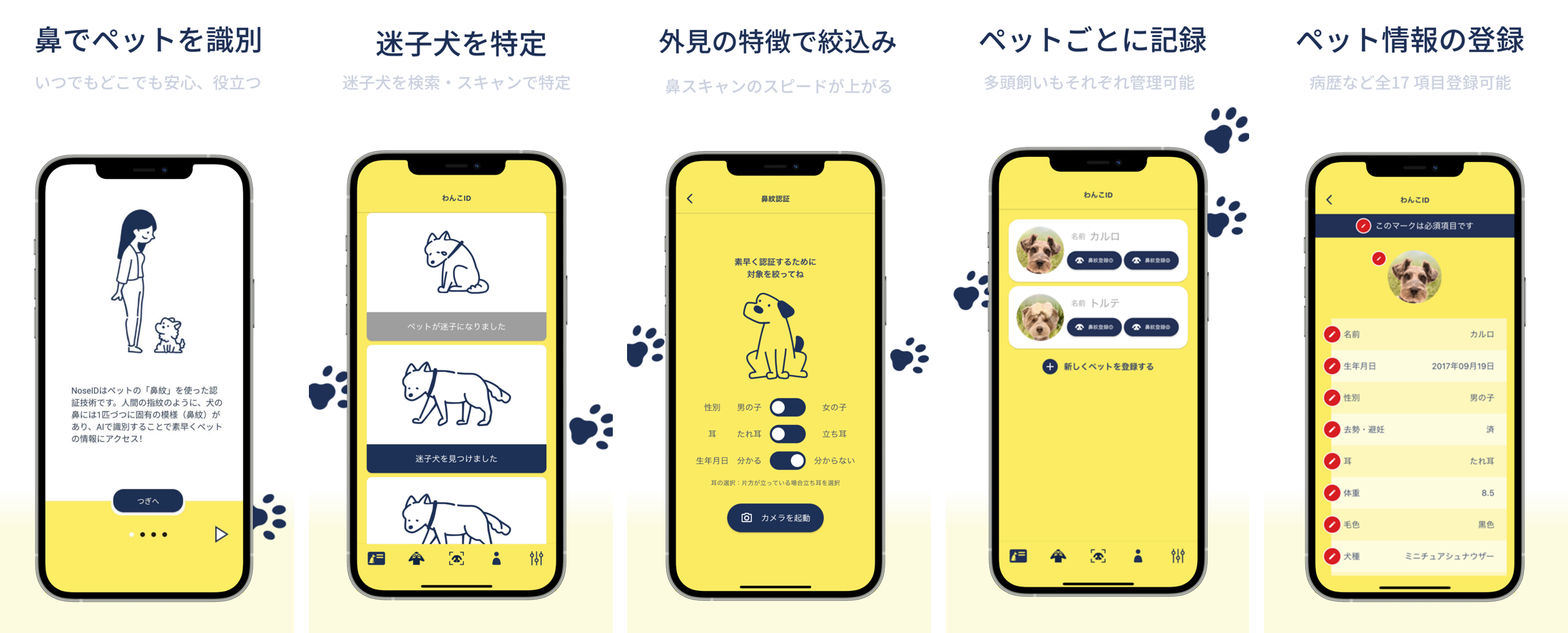 飼い主がアプリで犬の鼻の動画を撮影し登録しておくと、発見者が犬の鼻を自身のスマホアプリで撮影することで登録済みの犬を照会できる仕組みです。鼻紋が一致した場合、発見者と飼い主が個人情報を伏せた状態でメッセージのやり取りもでき迷い犬は即時飼い主の元に戻ることができます。また万が一愛犬が迷子になった際には周辺エリアのユーザーに通知することができ飼い主やサロン・病院等が迷子探しを手伝ってくれるかもしれません。