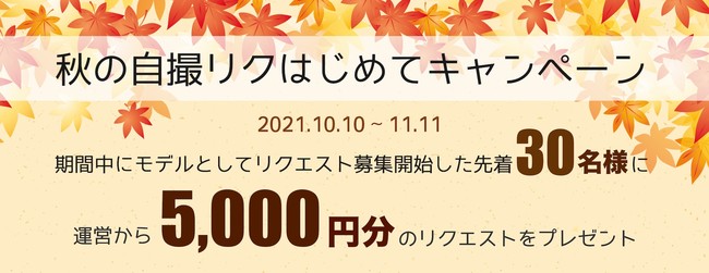 また、このキャンペーン期間にあわせ、はじめて自撮リクに登録し、モデルとしてリクエストを募集開始した先着30名様に、運営から5000円分のリクエストをプレゼントする「自撮リクはじめてキャンペーン」も実施いたします。