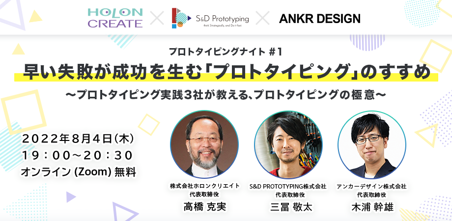 S&D Prototyping株式会社(本社:東京都武蔵野市、代表取締役:三冨 敬太)は、株式会社ホロンクリエイト(神奈川県横浜市、代表取締役:高橋 克実)とアンカーデザイン株式会社(東京都品川区、代表取締役:木浦 幹雄)とともに、プロトタイピングに特化したイベント「プロトタイピングナイト」を開始しました。初回のイベントを2022年8月4日 (木) 19:00 - 20:30にオンラインで無料にて実施します(https://prototyping-night.peatix.com)。