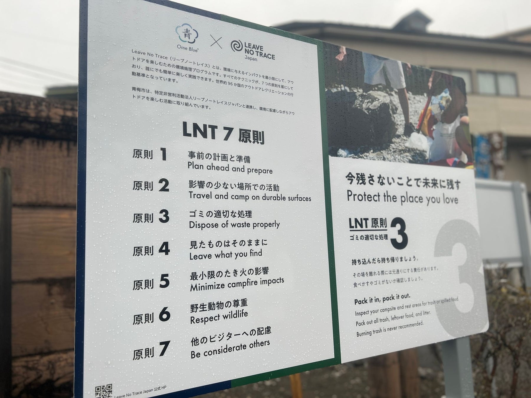 リーブノートレイスジャパンと連携協定を結んだ青梅市(令和5年締結)が、青梅市の多摩川沿いにある釜の淵に、アウトドアやバーベキュー後のごみが放置されている地域課題を解決する一歩として、LNTとコラボレーションをした啓発看板を、多摩川沿いにある「釜の淵公園」4箇所に設置しました。リーブノートレイスジャパンは、引き続き青梅市と連携をしながら、知識を深めるための定期的な勉強会やワークショップ・イベント、地域住民との対話の場の提供等、企画していきます。