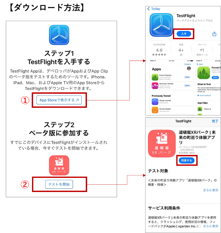 下記の QR コードを読み込み、サイトに記載の手順に従って①「TestFlight」アプリをインストールし、 そのあと②「道頓堀 XR パーク」アプリをインストールします。