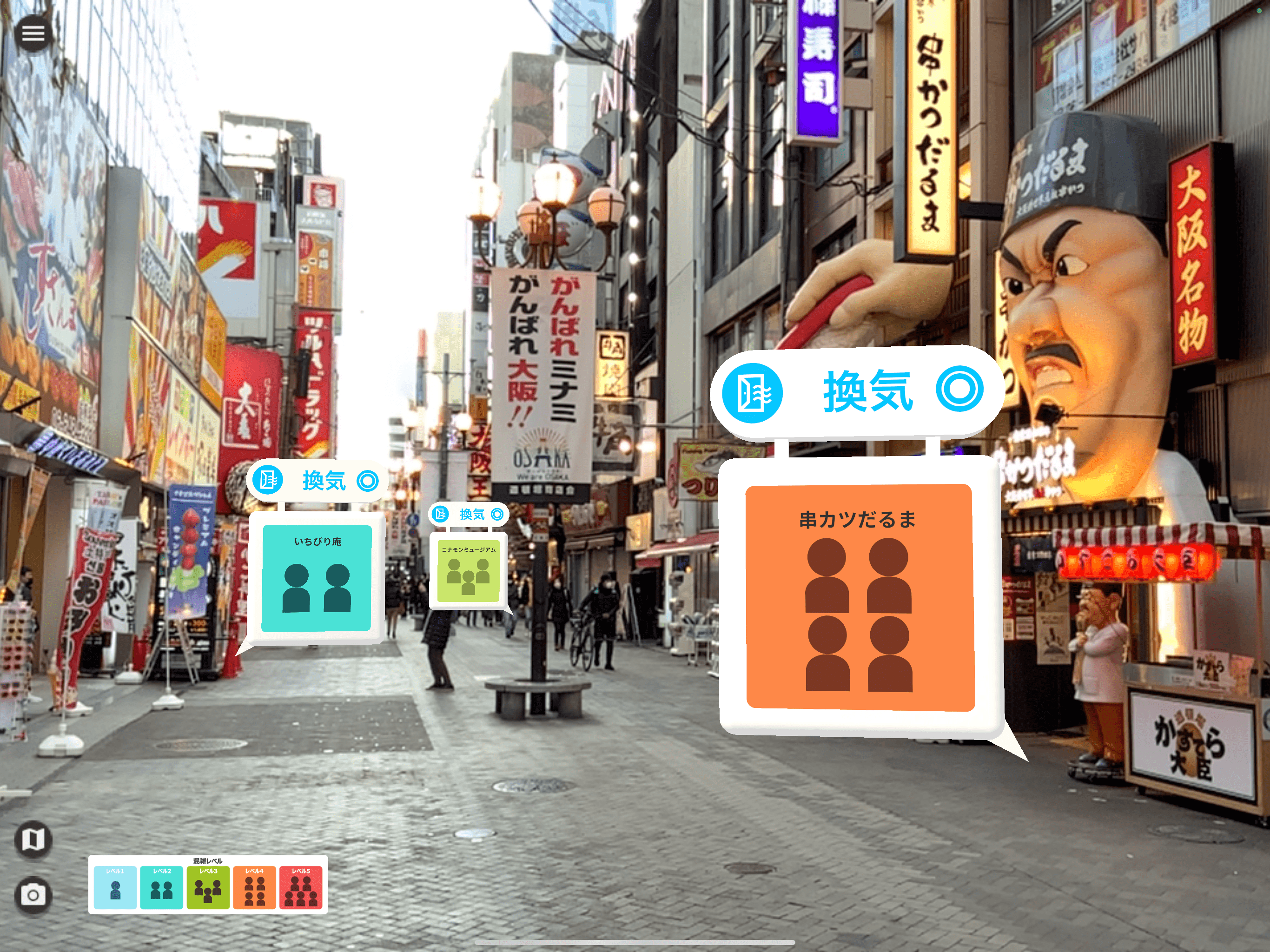 道頓堀商店街のイベント参画各店舗に設置された CO2センサー装置や人感センサーにより、お店に 入る前にスマートフォンで店舗の混雑状況や CO2濃度を AR で表示します。安心して飲食や買い物 をお楽しみいただけます。