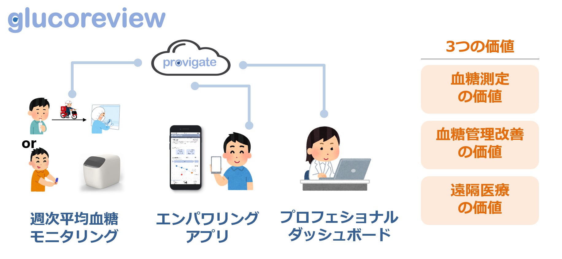 PROVIGATEは、血糖改善プログラム "Glucoreview®" の開発と提供を行うスタートアップ企業です。当社のプログラムはグリコアルブミンによる週次平均血糖モニタリング (郵送検査およびPOCT) と行動変容支援アプリから構成されます。血糖測定の価値に加え、血糖管理改善の価値、並びに遠隔医療の価値もあわせて提供することをめざしています。