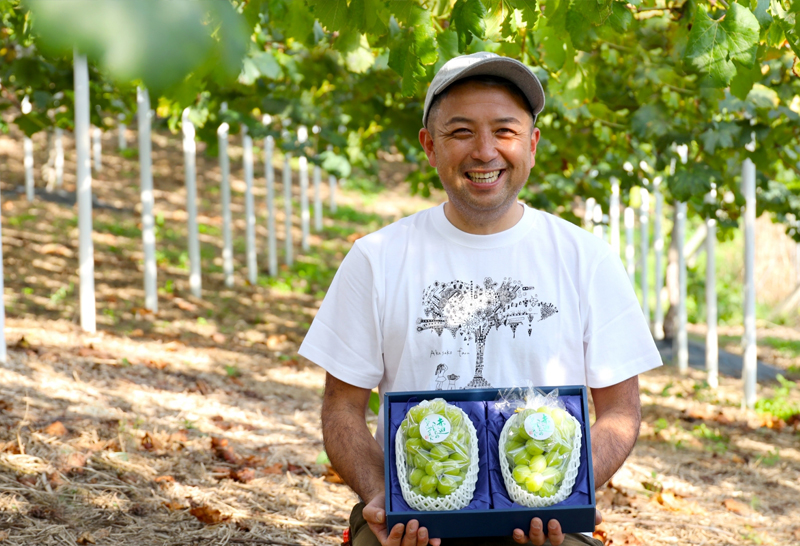 備中町でピオーネやシャインマスカットをこだわり栽培する笑顔のたえない注目のぶどう農家さんです。
