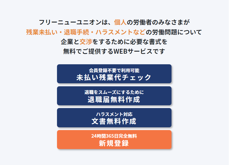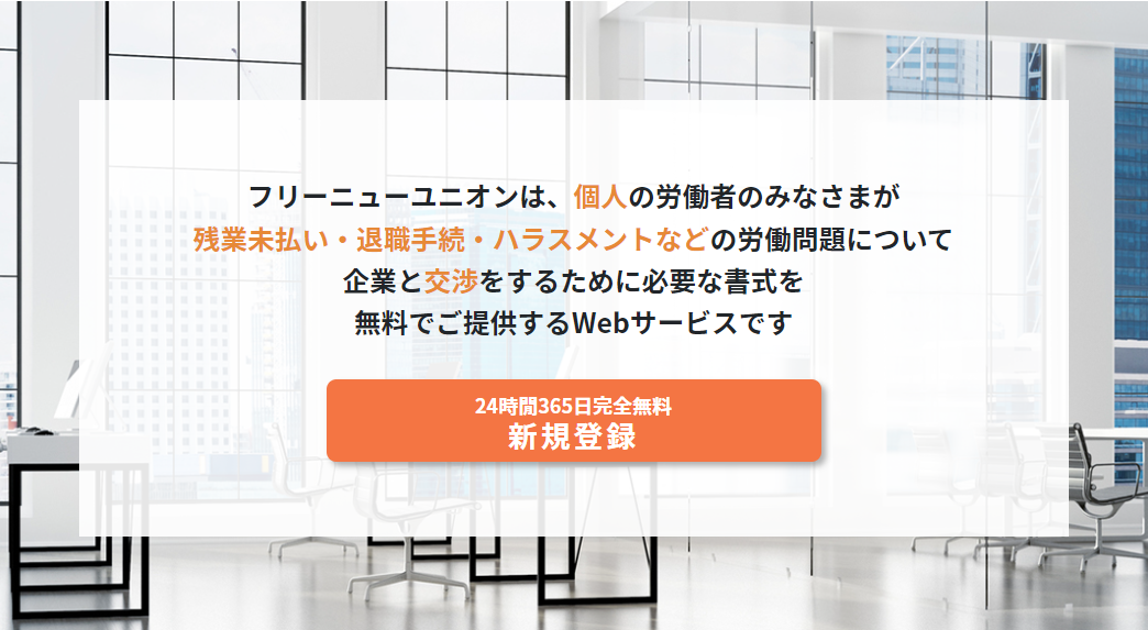「FREE NEW UNION」https://free-union.jpは、労働者が個人であっても企業と残業未払いなどを交渉するために、自ら簡単なステップで必要な書類を作成してダウンロードできるWEBサービスです。