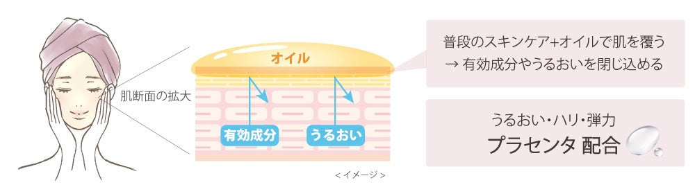 秋冬の過酷な乾燥は、エイジングの大きな原因の一つです。バリア機能となるオイルを配合し、肌表面にオイルの膜を形成。有効成分やうるおいを閉じ込め贅沢な保湿を叶えます。さらに、うるおいをキープし、ハリ・弾力を与える「プラセンタ」も配合。肌をいきいきとした状態へ導きます。
