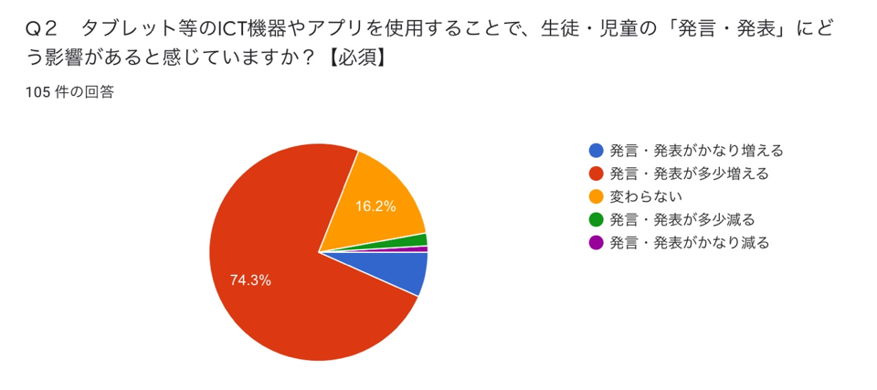 岡山県高梁(たかはし)市では、高梁市内の小学校・中学校全校にアンケート調査を実施したところ、タブレット等のICT機器やアプリを使用することで「生徒・児童の発言・発表がかなり増える」と回答したは6.7%、「生徒・児童の発言・発表が多少増える」と回答したのは72.3%となり、「かなり増える」「多少増える」を合わせて79.0%となった。