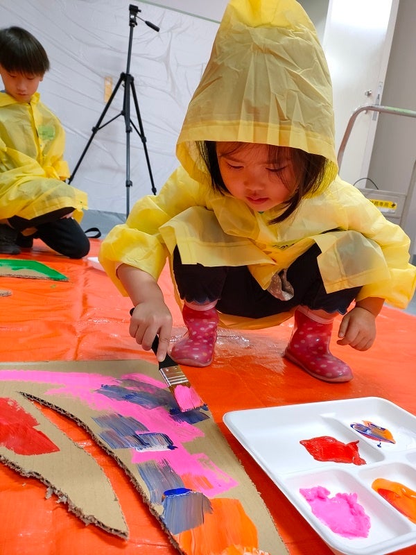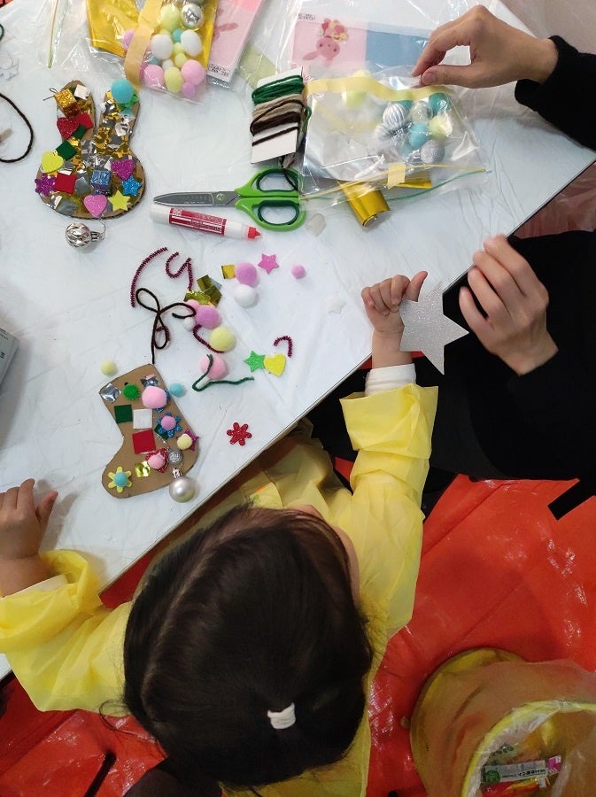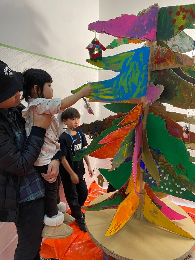 廃棄予定の段ボールをこどもたちが思いのままにペイントし、みんなでアートなクリスマスツリーをつくるイベントを実施。家ではできないダイナミックな色塗りがこどものクリエイティブ心を解放させる機会になりました。