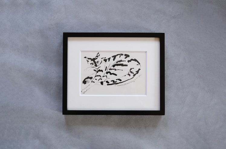 Tomohiro Noda(marini*monteany)さんによる、保護猫ドローイング作品。熊本県で動物愛護センターや動物愛護団体と共に譲渡会を運営する「ジョートフル熊本プロジェクト」へ売上の20%を寄付するアート作品です。猫らしい表情や仕草が伝わる動きのあるドローイング原画作品はモダンなインテリアにも似合います。