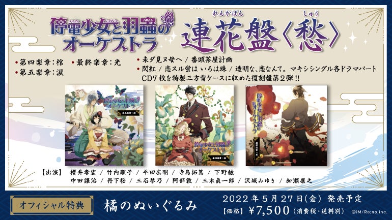 「連花盤(れんかばん)」は ドラマCD本編全7巻を、前半:詩(し)・後半:愁(しゅう)に分け、当時発売していたマキシシングルに収録されていたミニドラマや、外伝的な小噺を全てまとめたお得な廉価版となっております。ここから物語に触れて頂く方はもちろん、既に作品を知ってくださっている方にも嬉しい、特製ケースと各種特典付きです。
