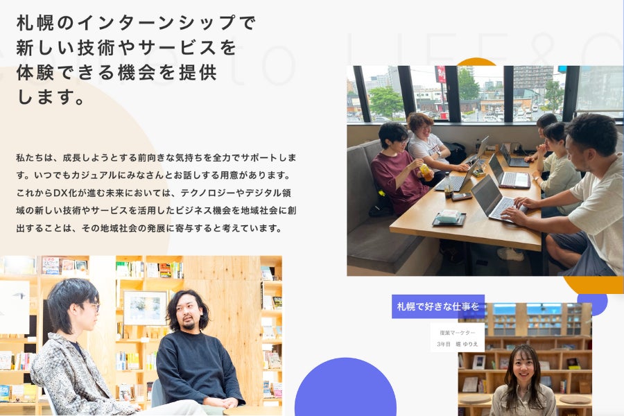 私たちは、北海道の若者たちに最新の技術やサービスを用いたビジネス機会を提供することで、若者たち個々人の可能性を引き出し、選択肢を増やすことで地域の発展に貢献することを目指しています。メンバーがそれぞれの個性や価値観、創造力やアイデアを用いて一つ一つの課題に真剣に向き合うことでお客様のビジネスを成功に導けるよう取り組んでいます。