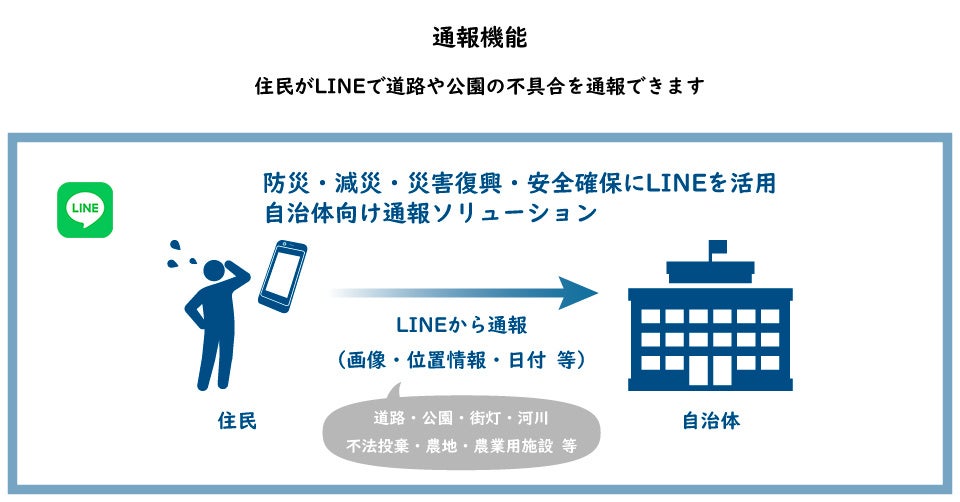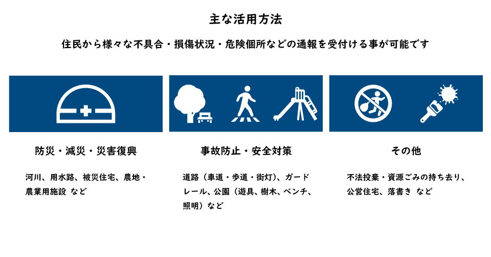 自治体は、住民から様々な不具合・損傷状況・危険個所などの通報を受付ける事が可能です。