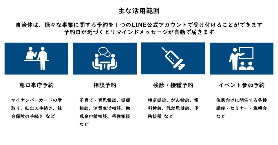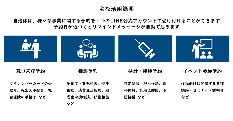 自治体は、様々な事業に関する予約を1つの LINE公式アカウントで受け付けることができます。