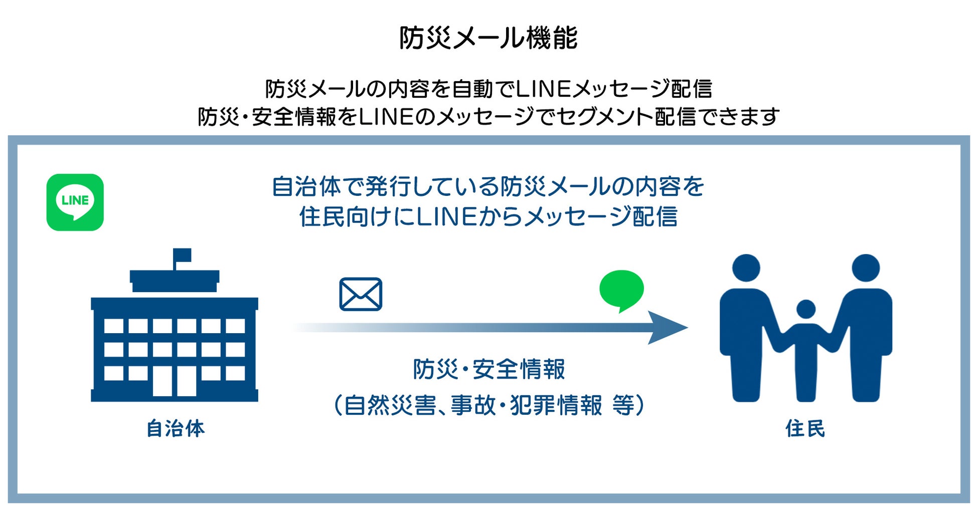 防災メールを連携し、メールの内容をLINEから自動でメッセージ配信することで、手動で行っていたLINEからのメッセージ配信作業が不要になります。