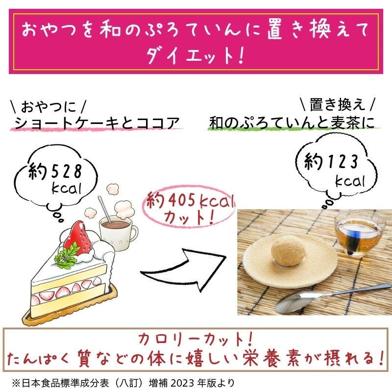 【和のぷろていん】はカロリーも低く、ダイエット中に少し甘い物が欲しくなった時のご褒美として、おすすめです。食が細くなり、お肉からのたんぱく質摂取が難しい方にも、手軽に食べられる新しいタイプの和菓子となっております。