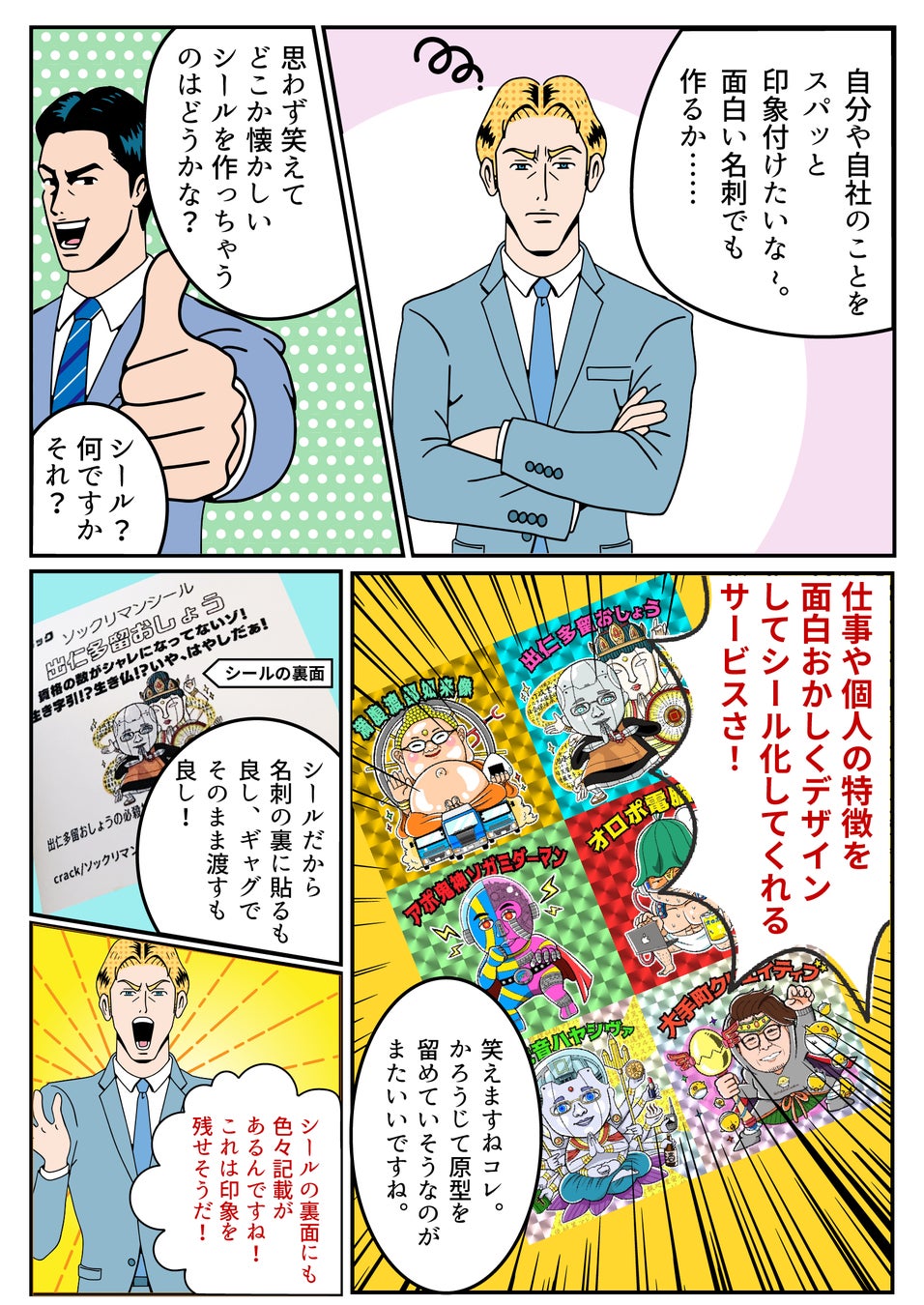 「名刺に面白いアイディアを」というテーマで生まれたソックリマンシールの導入をぜひご検討ください。