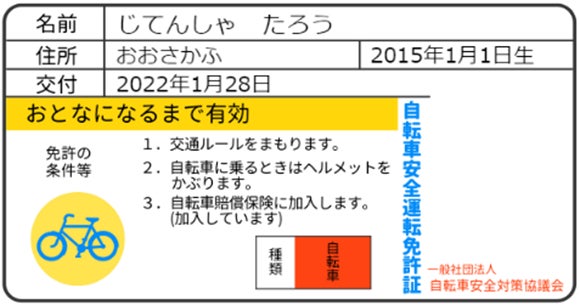 上記の10問全てを終了し、【自転車の安全利用に関する宣言】に賛同をしていただくと当協議会の「自転車安全運転免許証」が発行されます。