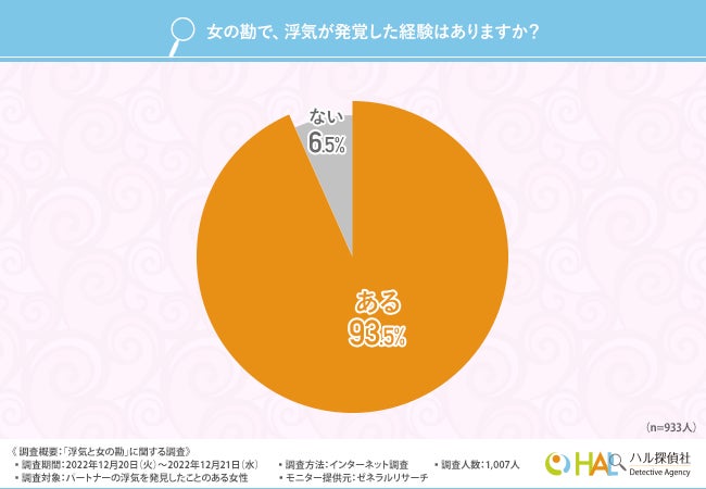 「女の勘で、浮気が発覚した経験はありますか?」と質問したところ、9割以上の方が『ある(93.5%)』と回答しました。