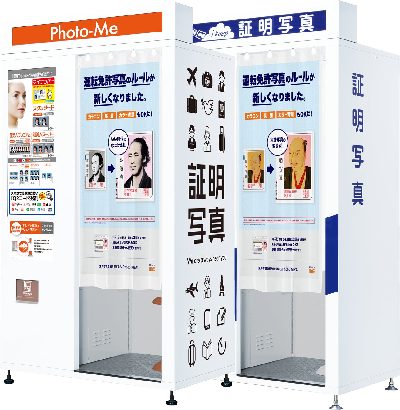 本キャンペーンでは、全国に設置している Photo ME 証明写真機のカーテンに、坂本龍馬と織田信長の2つのバージョンを順次掲出していく予定です。おなじみの真剣な眼差しで遠くを見つめる坂本龍馬の白黒写真は、口元がニッコリ、ピンク色の背景に。無表情の織田信長も口元に微笑みを浮かべ、さらにはカラコンを入れてイケオジに。新しくなった運転免許証写真のルールを、劇的に変化した二人の偉人の写真とともに実感してみてください。