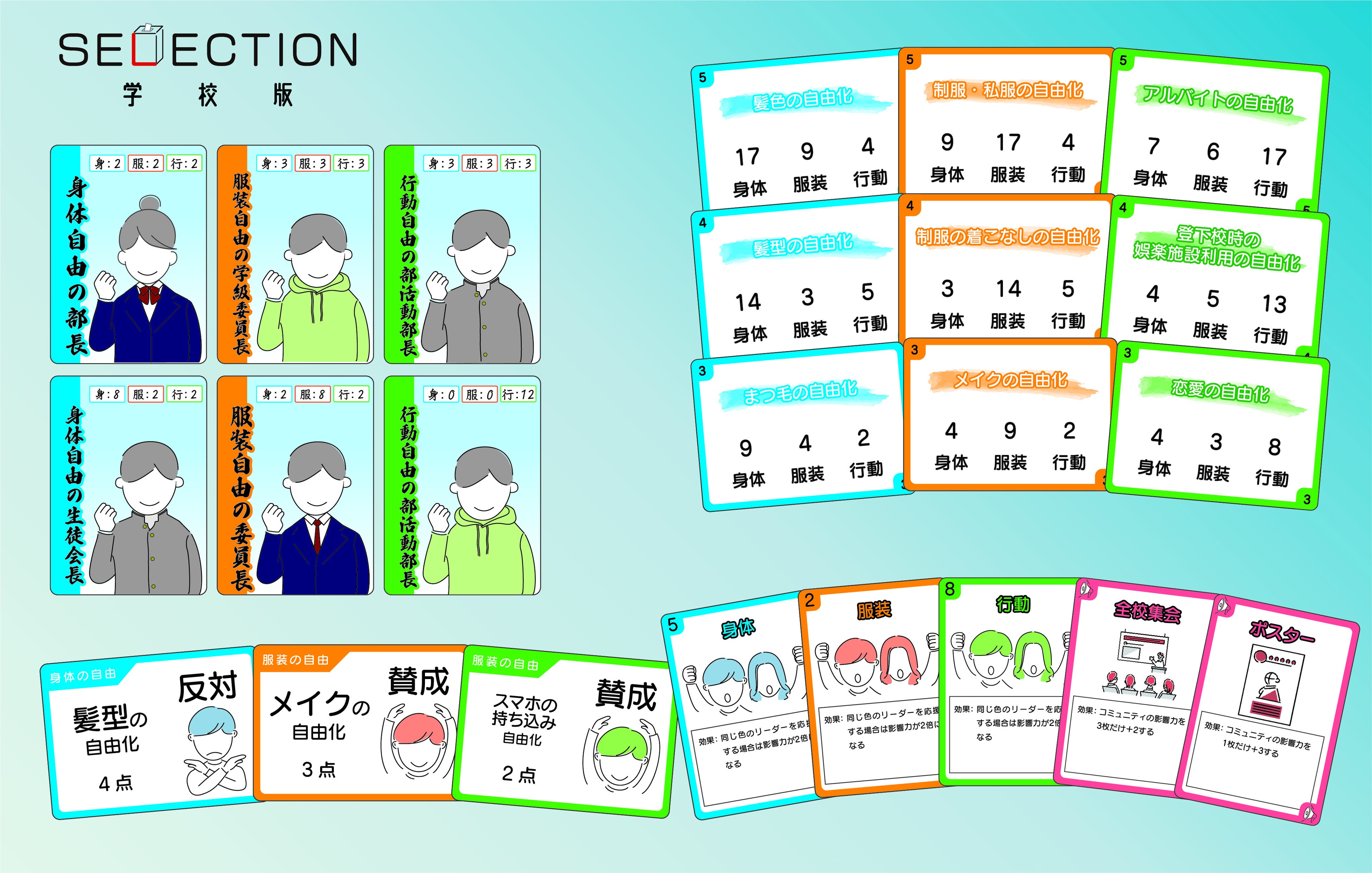 一方で、選挙権を持たない18歳未満の子どもたちに対しても政治教育を行う必要があるが、選挙をテーマにしたゲーム教材は身近に感じにくいため、「SELECTION」の学校版を開発した。学校版では、生徒会役員選挙をゲーム化しており、小学生からプレイすることができるため、18歳未満においても投票を自分ごと化することができる。