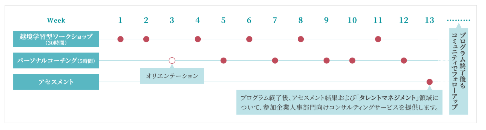 また、個人の行動支援をする「パーソナルコーチング」、越境体験の変化を可視化する「アセスメント」により実現に向けた実践を加速します。