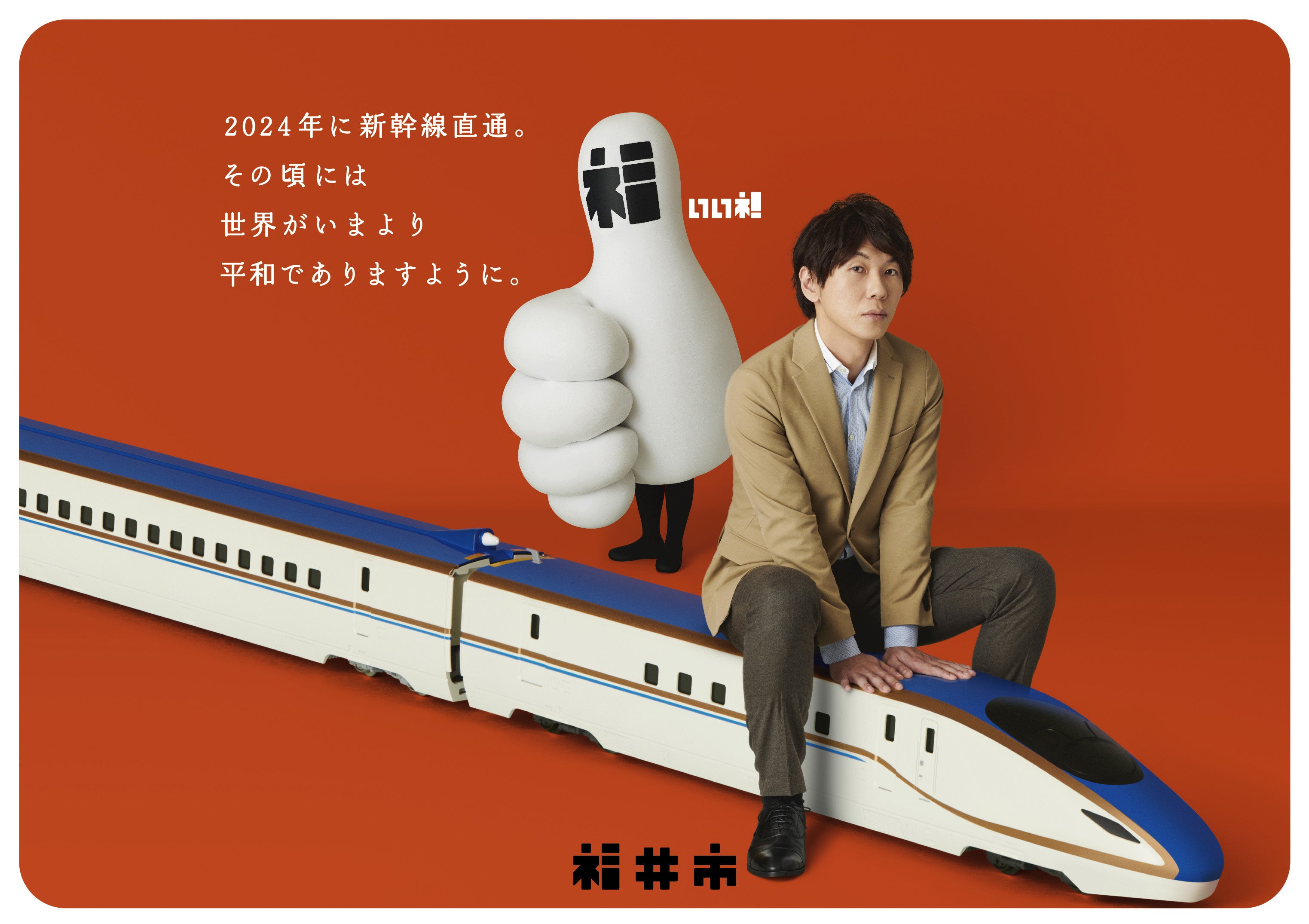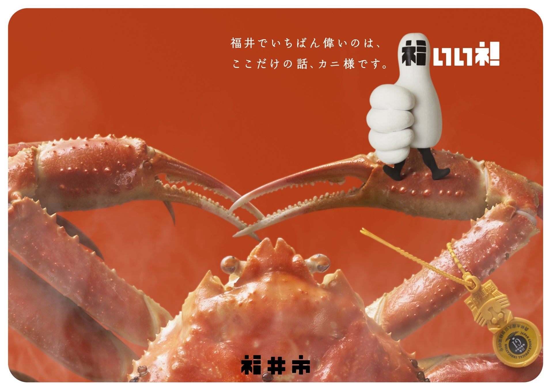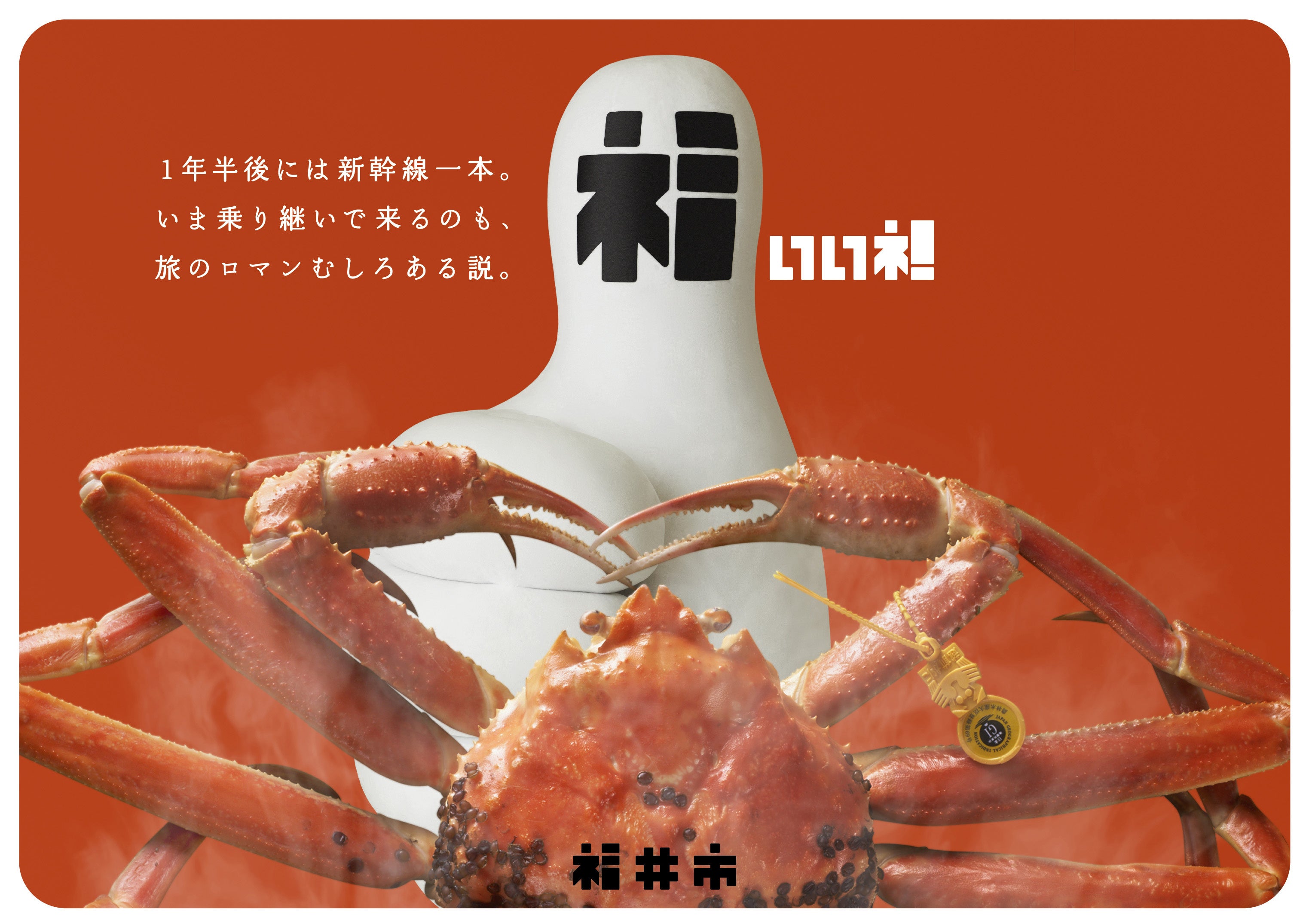 福井市が、2024年春の北陸新幹線福井開業を見据え、社会学者で作家の古市憲寿さんを起用した福井開業プロモーションポスターを制作しました。今回のポスターでは、市のイメージロゴを具現化したキャラクター「福いいネ!くん」に加え、福井の冬の味覚の王者「越前がに」と古市さんがコラボレーションしています。