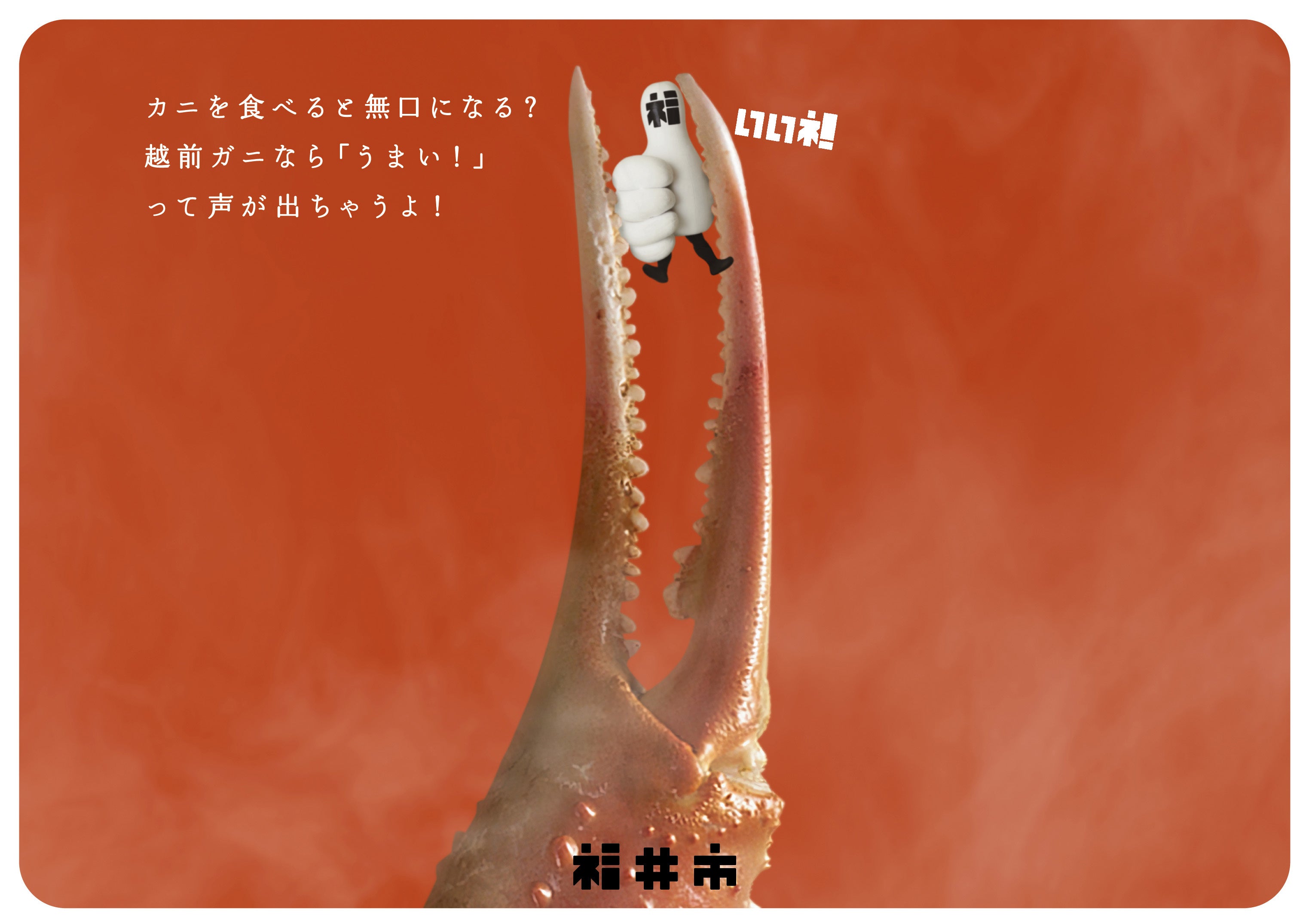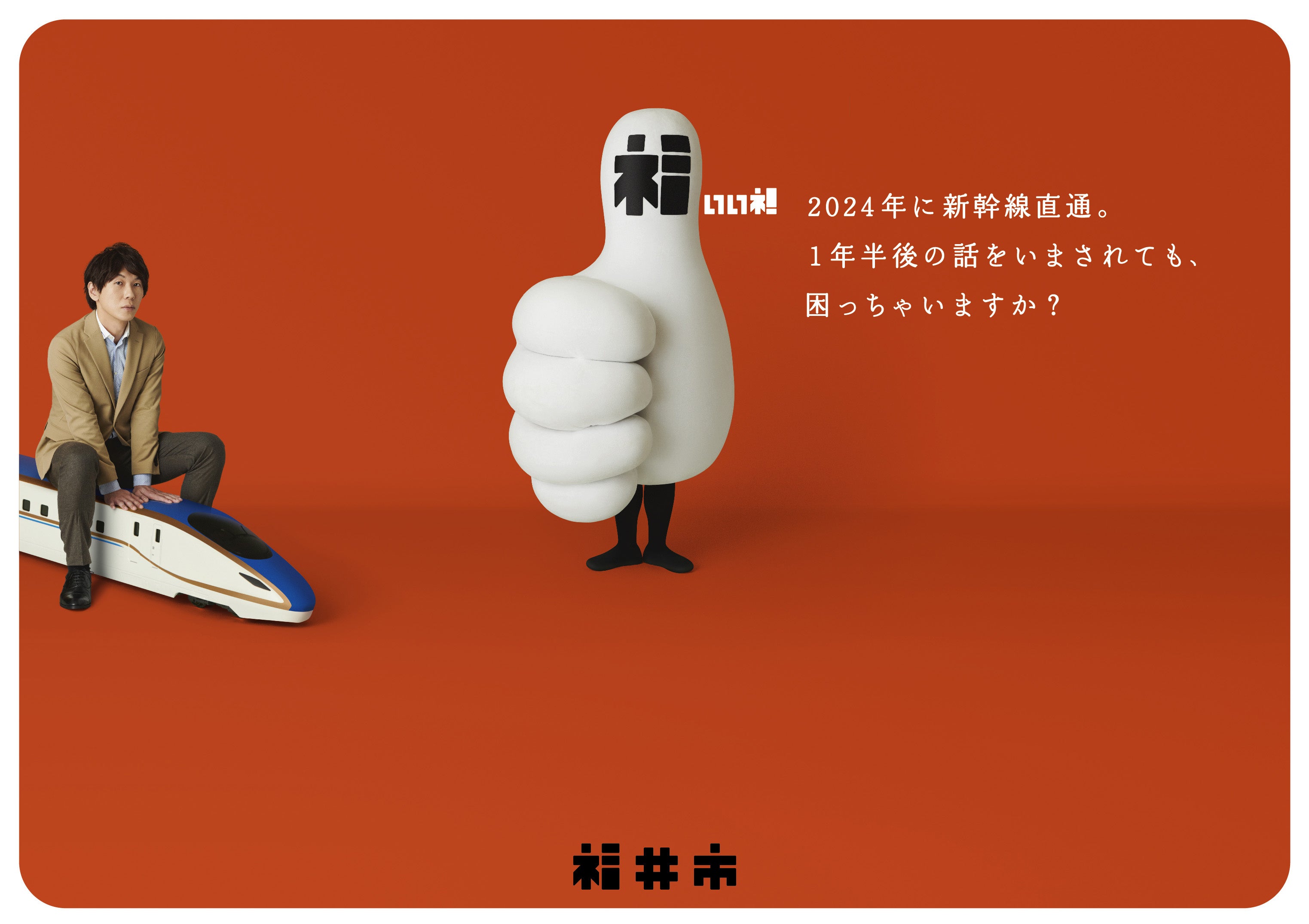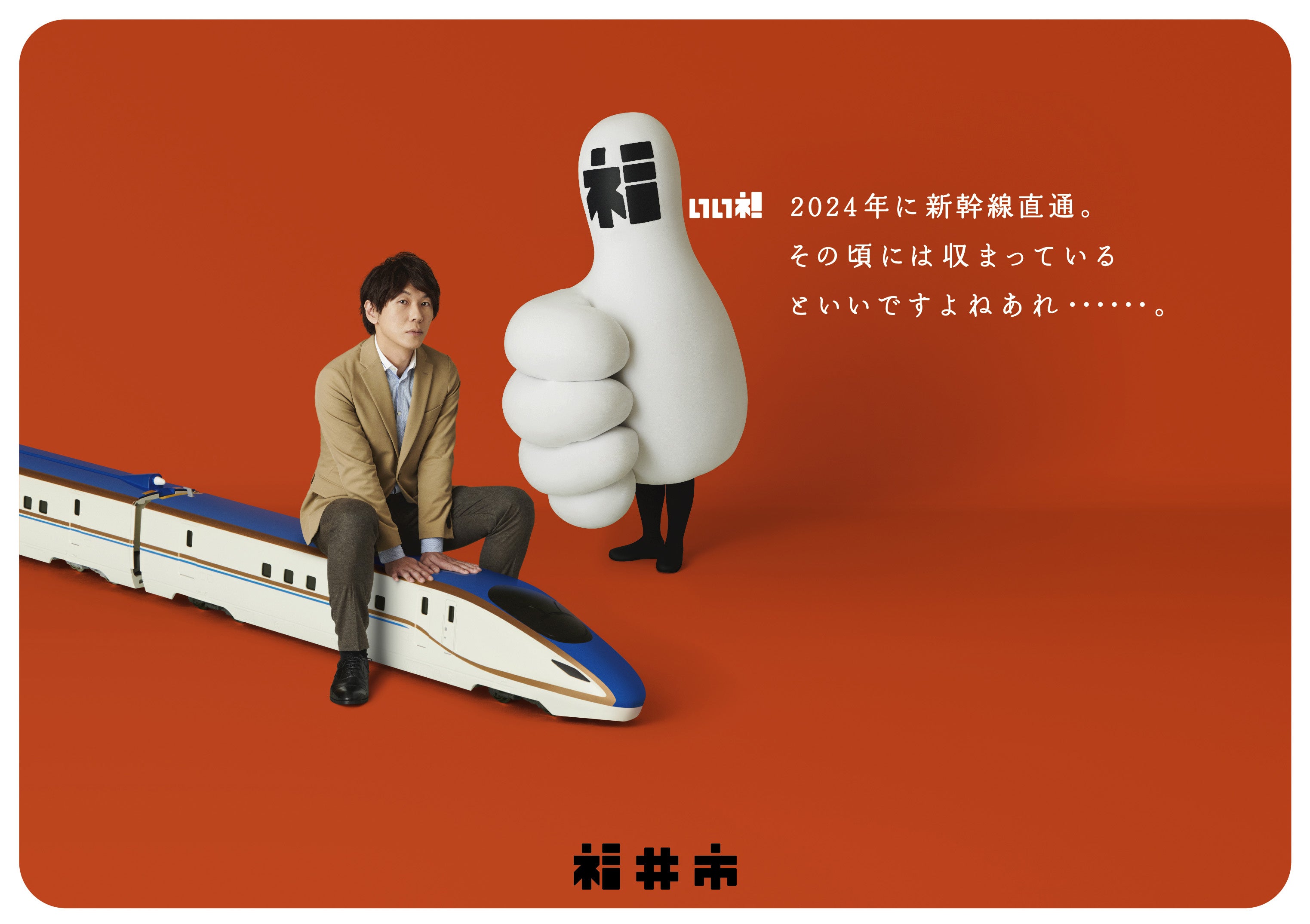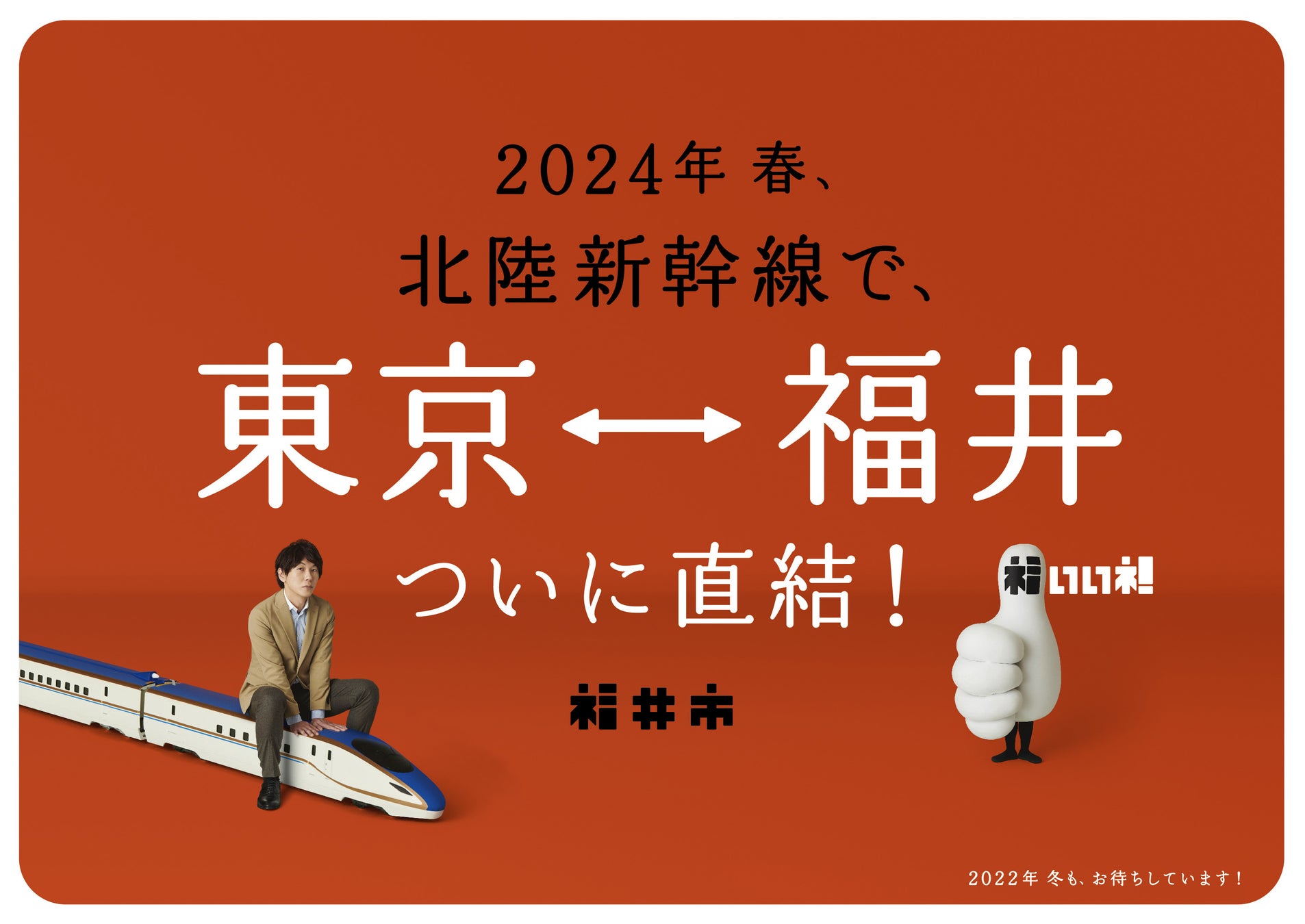 福井市が、2024年春の北陸新幹線福井開業を見据え、社会学者で作家の古市憲寿さんを起用した福井開業プロモーションポスターを制作しました。今回のポスターでは、市のイメージロゴを具現化したキャラクター「福いいネ!くん」に加え、福井の冬の味覚の王者「越前がに」と古市さんがコラボレーションしています。
