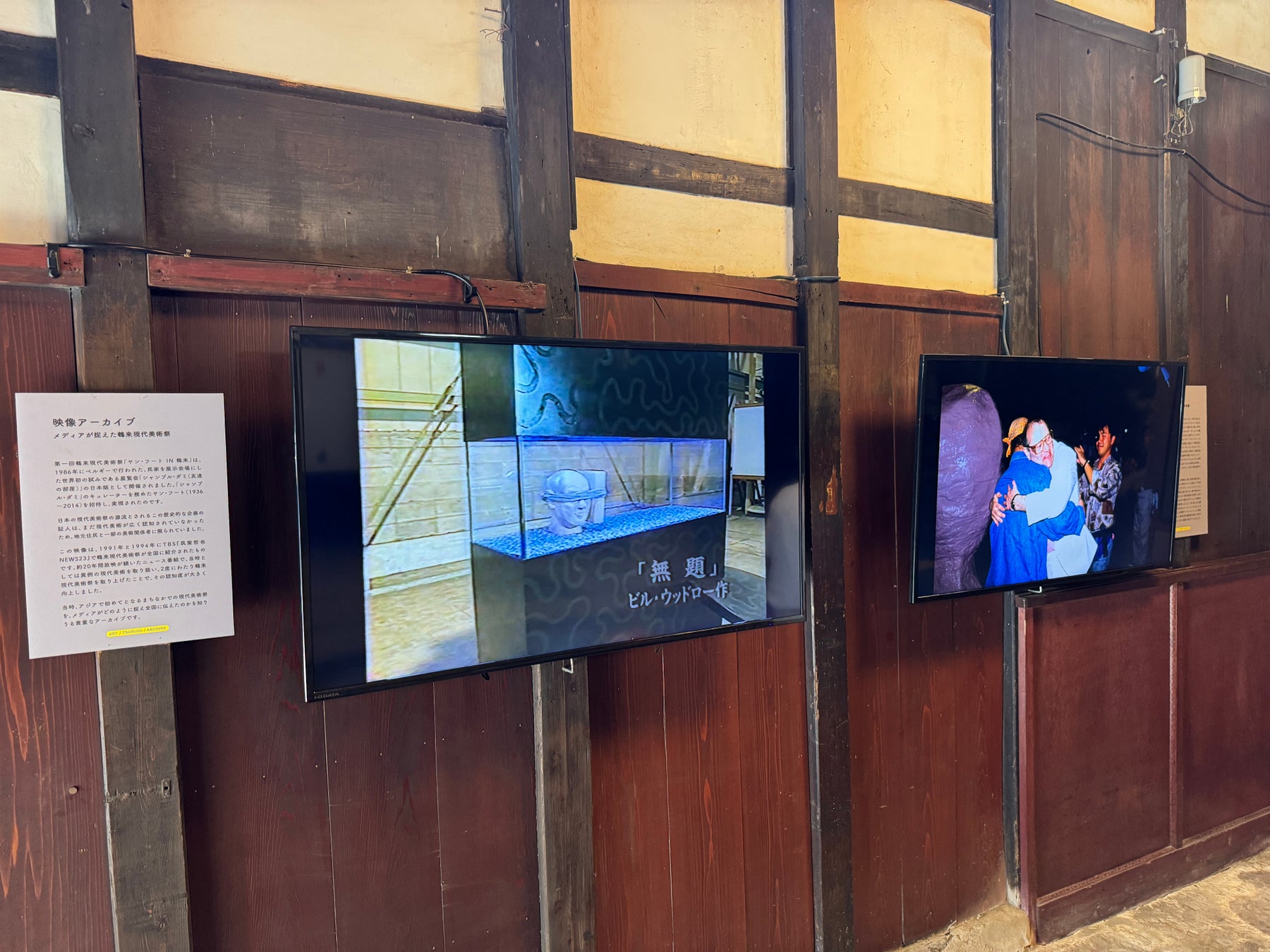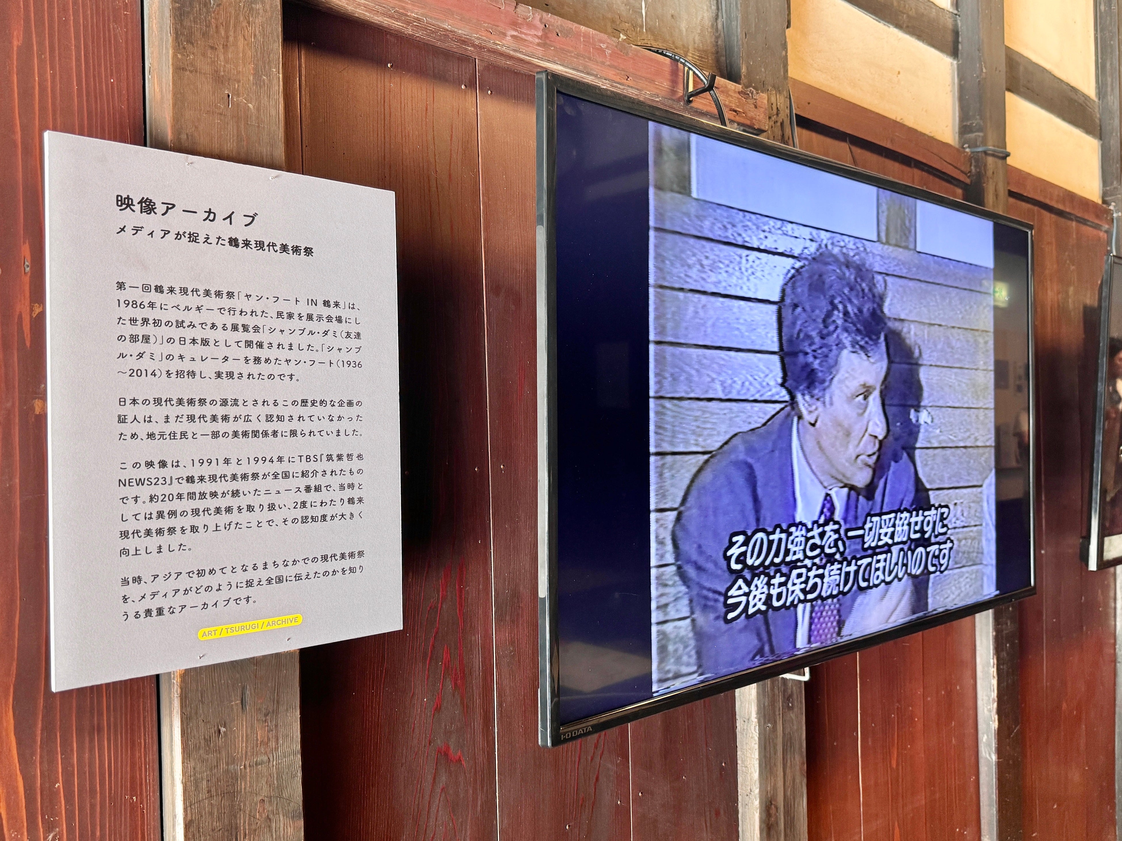 展示紹介されている全国ネットの報道番組内での特集映像は、当時では異例となる現代美術を扱い、鶴来現代美術祭が2度に渡り紹介されたもので、鶴来現代美術祭が全国的に認知されるきっかけとなりました。当時アジア初とも言えるまちなかでの現代美術祭という今までにない地域での事象を、メディアがどう捉え日本全国に伝えたか、興味深いアーカイブです。