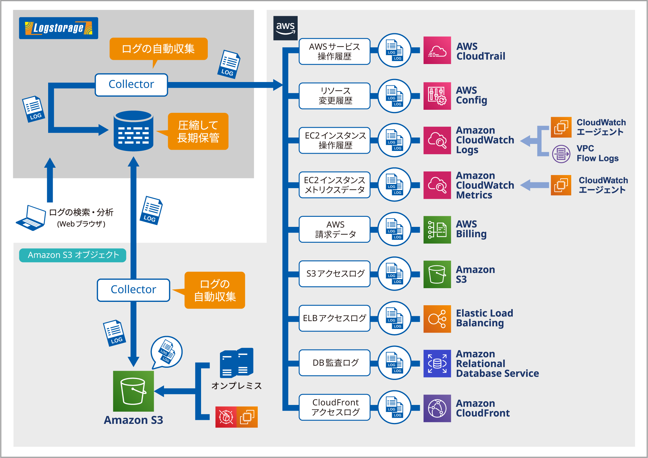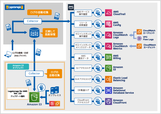 2022年1月14日リリースのVer. 3.0では、Amazon S3 に出力されるログファイルを収集する機能を追加しました。AWSの汎用性を向上させるために、オンプレミスサーバのログやAWSの各サービスのログを Amazon S3 に出力している場合でも、「Logstorage」によるログ収集・管理が可能となります。